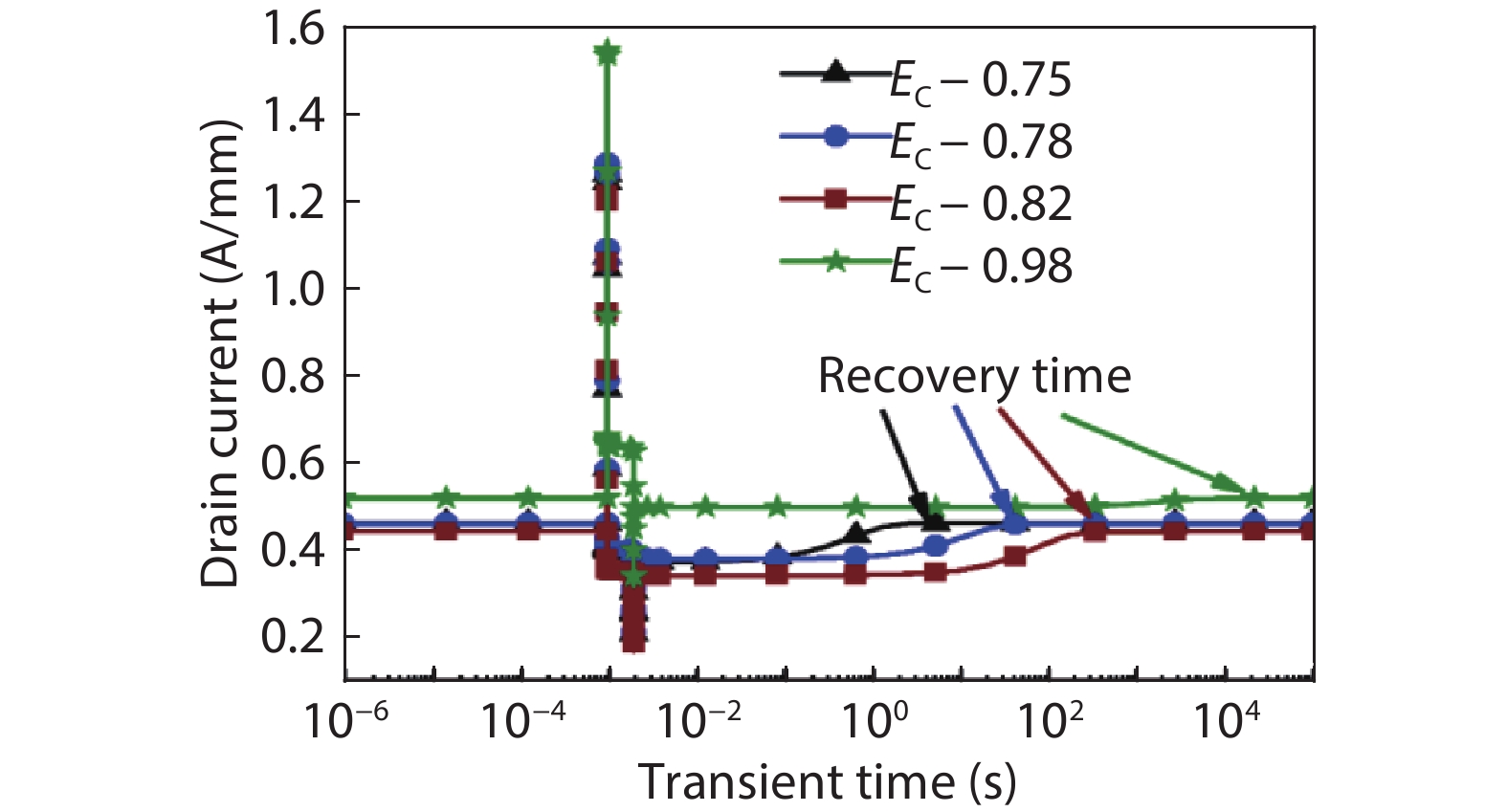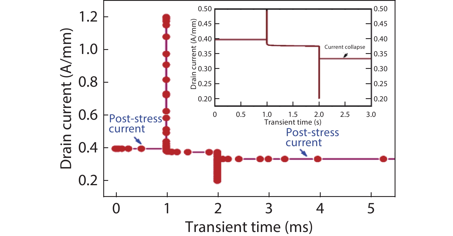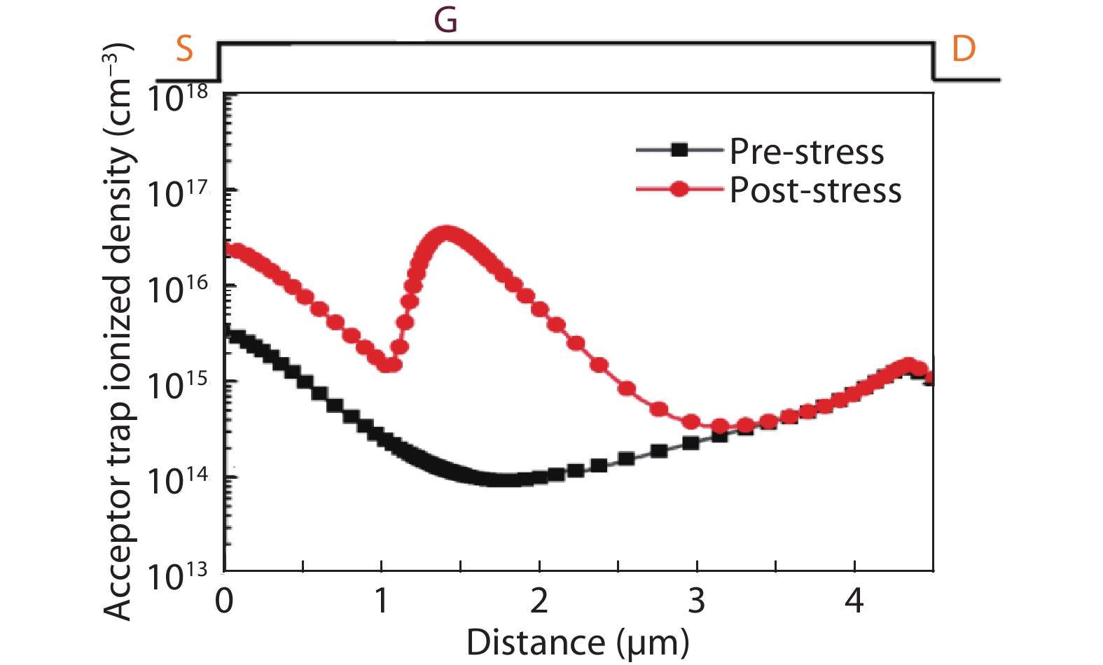 Abstract: In this paper, drain current transient characteristics of β-Ga2O3 high electron mobility transistor (HEMT) are studied to access current collapse and recovery time due to dynamic population and de-population of deep level traps and interface traps. An approximately 10 min, and 1 h of recovery time to steady-state drain current value is measured under 1 ms of stress on the gate and drain electrodes due to iron (Fe)–doped β-Ga2O3 substrate and germanium (Ge)–doped β-Ga2O3 epitaxial layer respectively. On-state current lag is more severe due to widely reported defect trap EC – 0.82 eV over EC – 0.78 eV, ?0.75 eV present in Iron (Fe)-doped β-Ga2O3 bulk crystals. A negligible amount of current degradation is observed in the latter case due to the trap level at EC – 0.98 eV. It is found that occupancy of ionized trap density varied mostly under the gate and gate–source area. This investigation of reversible current collapse phenomenon and assessment of recovery time in β-Ga2O3 HEMT is carried out through 2D device simulations using appropriate velocity and charge transport models. This work can further help in the proper characterization of β-Ga2O3 devices to understand temporary and permanent device degradation.