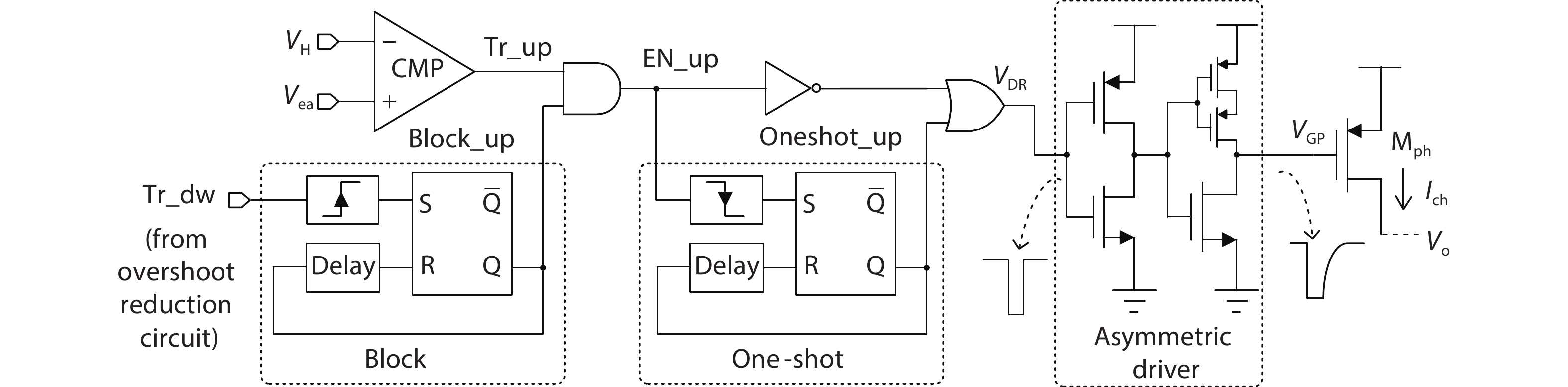 Abstract: A 30 MHz voltage-mode controlled buck converter with fast transient responses is presented. An improved differential difference amplifier (DDA)-based Type-III compensator is proposed to reduce the settling times of the converter during load transients, and to achieve near-optimal transient responses with simple PWM control only. Moreover, a hybrid scheme using a digital linear regulator with automatic transient detection and seamless loop transition is proposed to further improve the transient responses. By monitoring the output voltage of the compensator instead of the output voltage of the converter, the proposed hybrid scheme can reduce undershoot and overshoot effectively with good noise immunity and without interrupting the PWM loop. The converter was fabricated in a 0.13 μm standard CMOS process using 3.3 V devices. With an input voltage of 3.3 V, the measured peak efficiencies at the output voltages of 2.4, 1.8, and 1.2 V are 90.7%, 88%, and 83.6%, respectively. With a load step of 1.25 A and rise and fall times of 2 ns, the measured 1% settling times were 220 and 230 ns, with undershoot and overshoot with PWM control of 72 and 76 mV, respectively. They were further reduced to 36 and 38 mV by using the proposed hybrid scheme, and 1% settling times were also reduced to 125 ns.