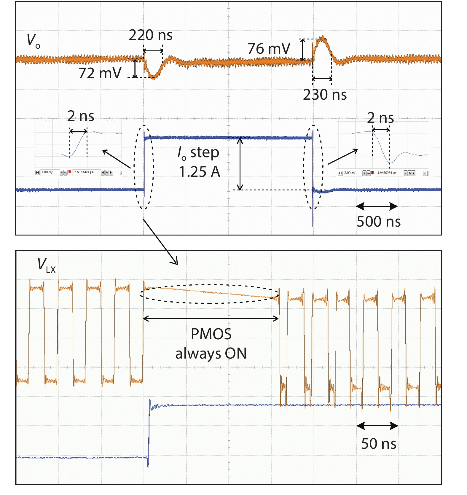 | Vo droop (mV) (% of Vo) | 55 (4.6) | 118 (9.8) | 80 (5.33) | 35 (1.75) | 100 (5.6) | 19 | 72/33 (4/1.83) | 36/12 (2/0.67) | |
