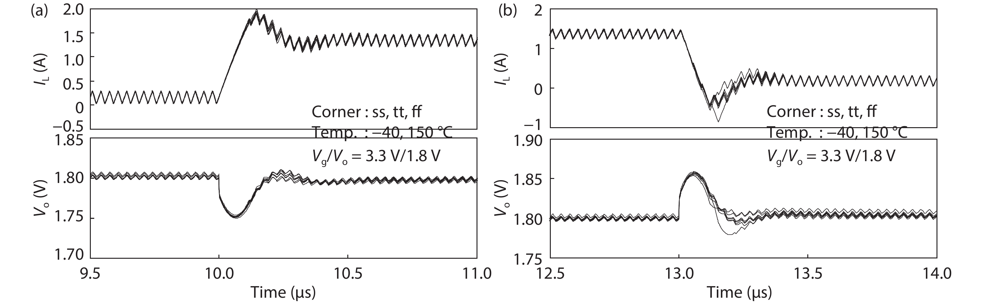 | Up-transient | Io step (A) (rise time (ns)) | 0.3 (20) | 5 (5) [4 phases] | 0.4 (10) [4 phases] | 0.4 (10) | 1.8 (5) [4 phases] | 0.27 (NA) | 1.25 (2)/0.62 (2) | |