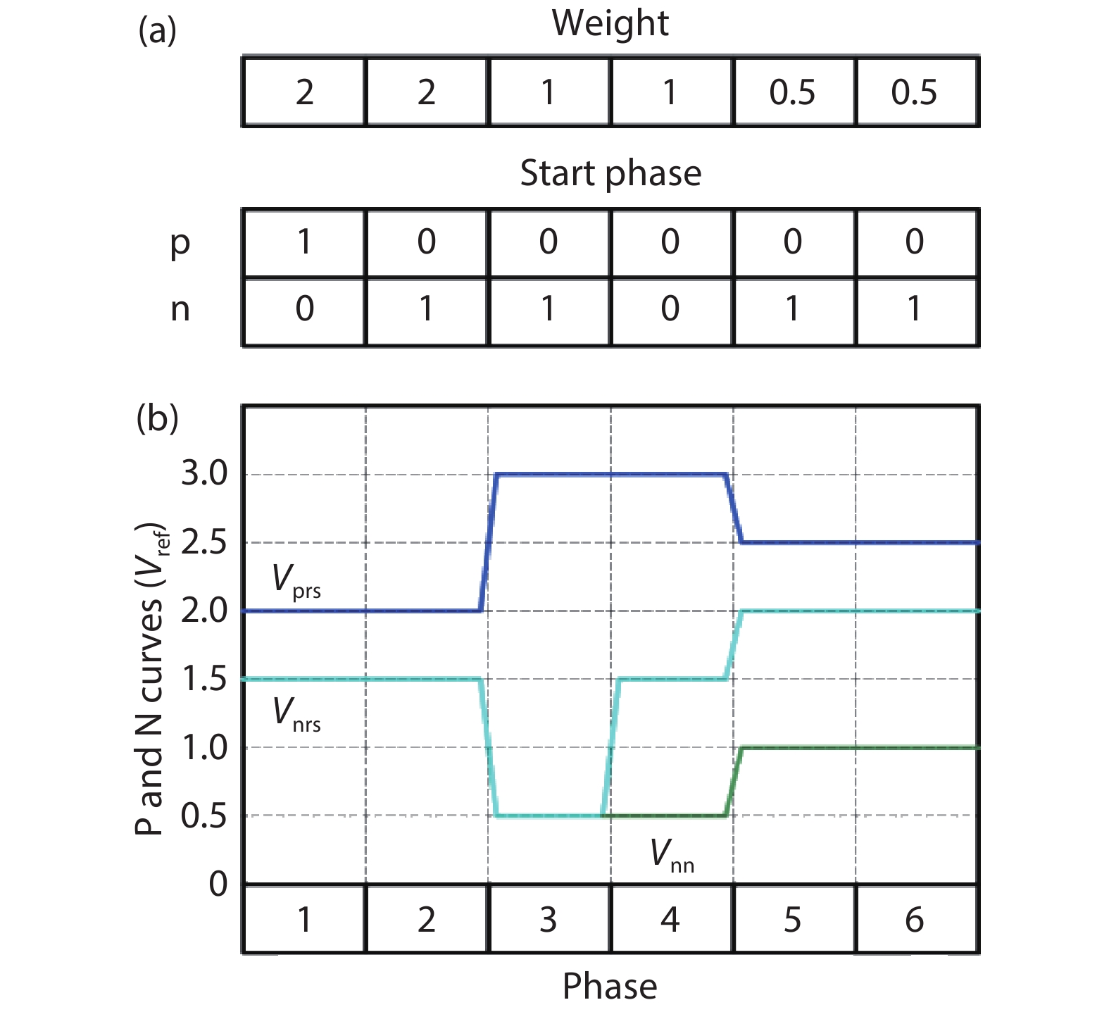 Fig. 7.  (a) Weights of a 6 phase SAR ADC and the start phase. (b) Residual voltage curves of P and N curves.