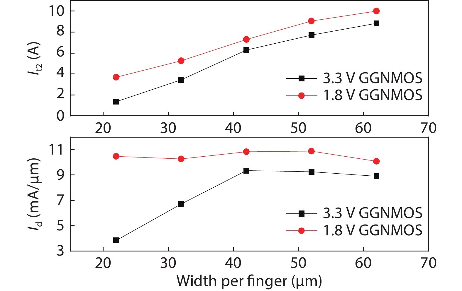 | GGNMOS device | Single finger width (μm) | Multi finger number | Total width (μm) | Vt2 (V) | It2 (A) | Discharge efficiency | Reference |