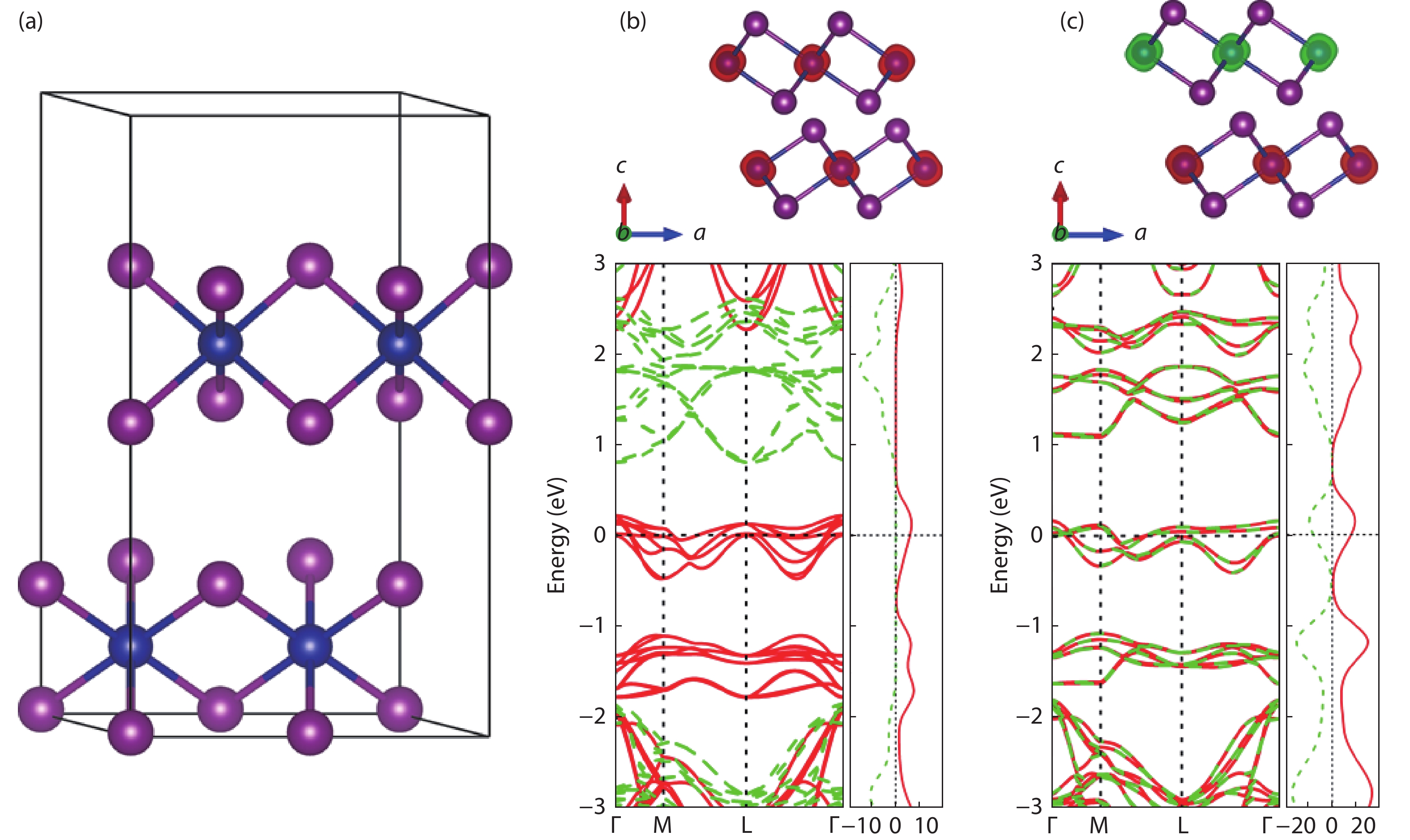 Fig. 1.  (Color online) (a) Crystal structure of bulk CrI2, and spin-polarized band structure and spin spatial distribution of (b) ferromagnetic and (c) antiferromagnetic orderings.