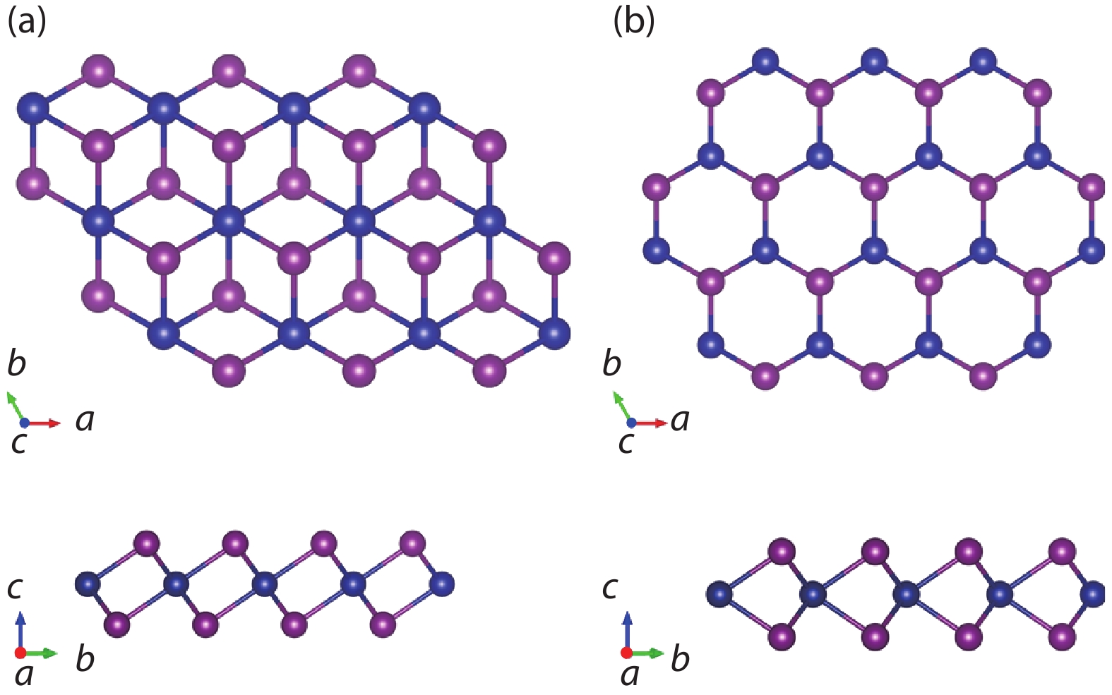 Fig. 2.  (Color online) (a) 1T and (b) 2H phases of CrI2 monolayers. The chromium and iodine atoms are illustrated with blue and purple spheres, respectively.