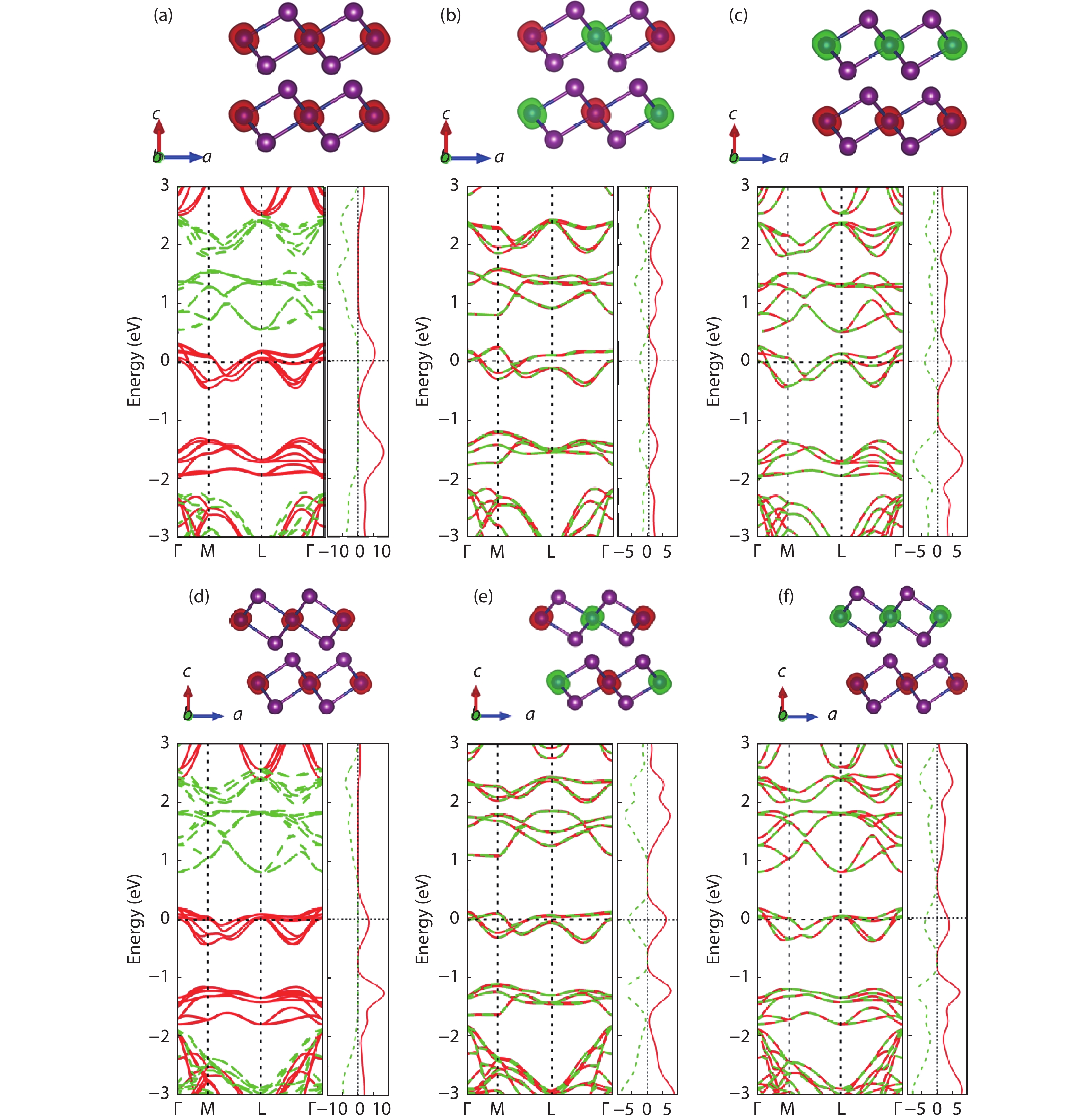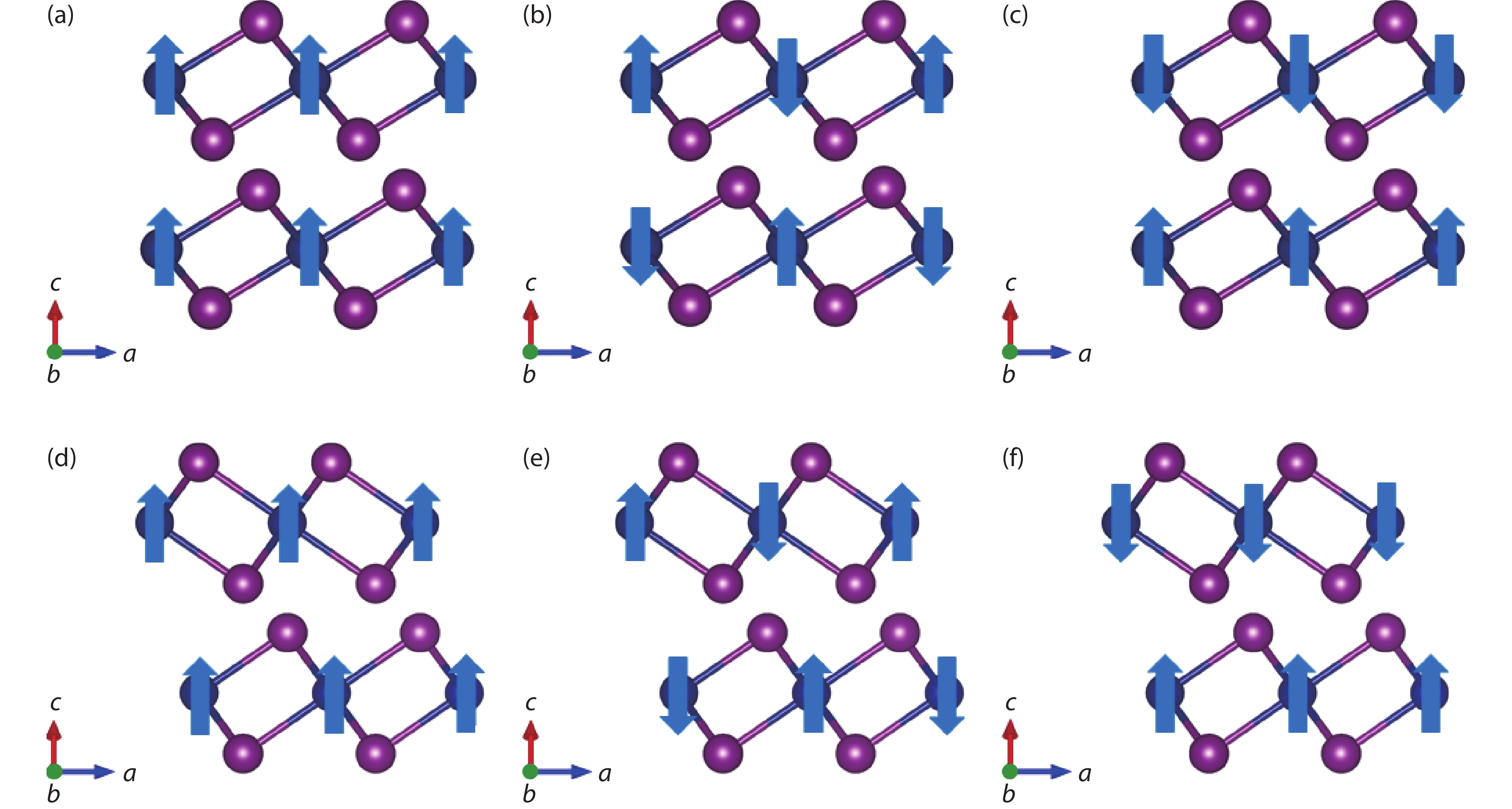 Fig. 4.  (Color online) Configurations of the model (a) AA-FM, (b) AA-AFM-a, (c) AA-AFM-f, (d) AB-FM, (e) AB-AFM-a, and (f) AB-AFM-f. The up and down arrows indicate the signs of initial magnetic moments in constrained DFT calculations.