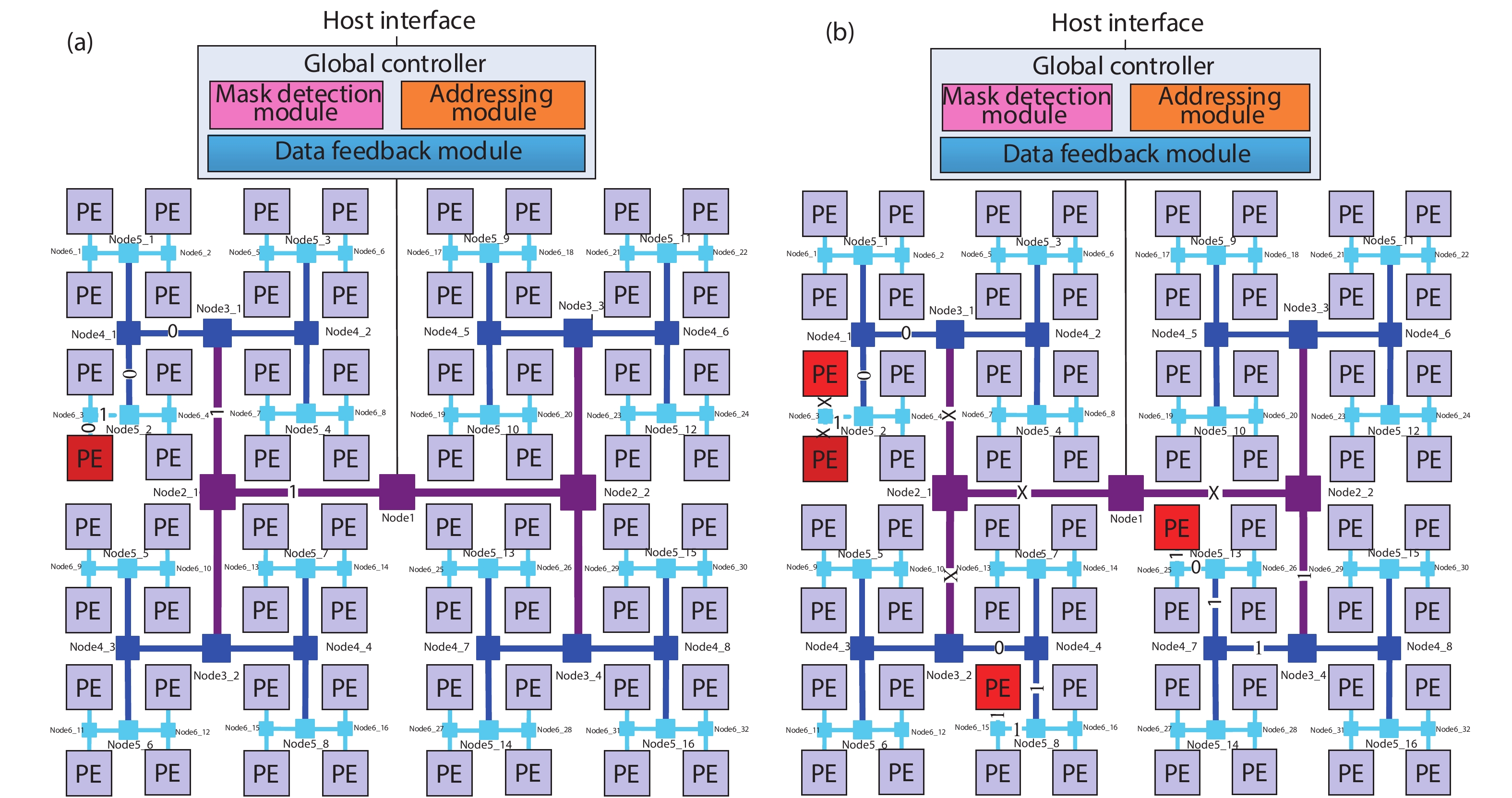 Fig. 1.  (Color online) The topology of HRM. (a) Unicast. (b) Multicast/broadcast.