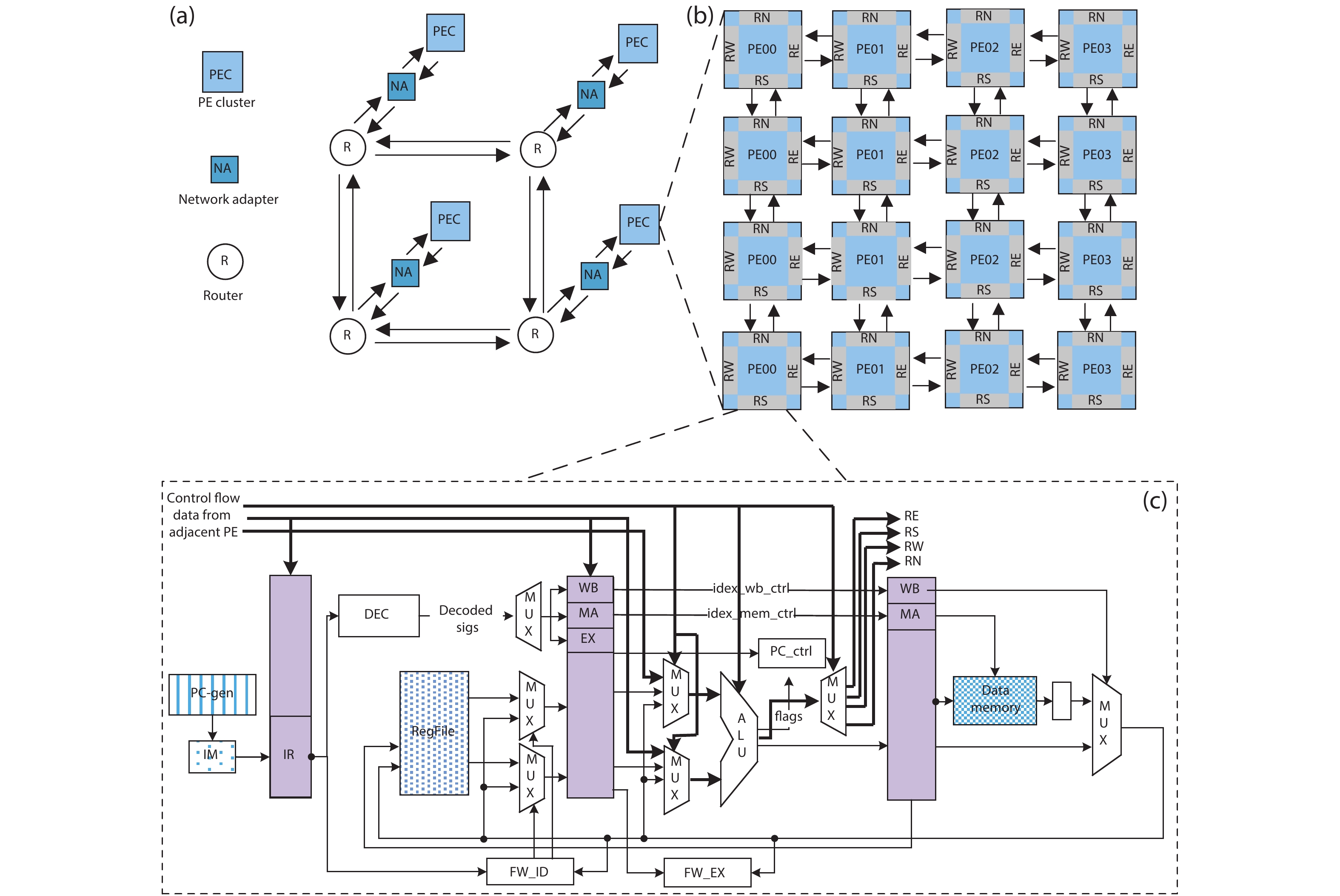 Fig. 2.  (Color online) Homogeneous thin-core PE array. (a) Inter –cluster communicate. (b) PE cluster. (c) Micro-architecture of PE.