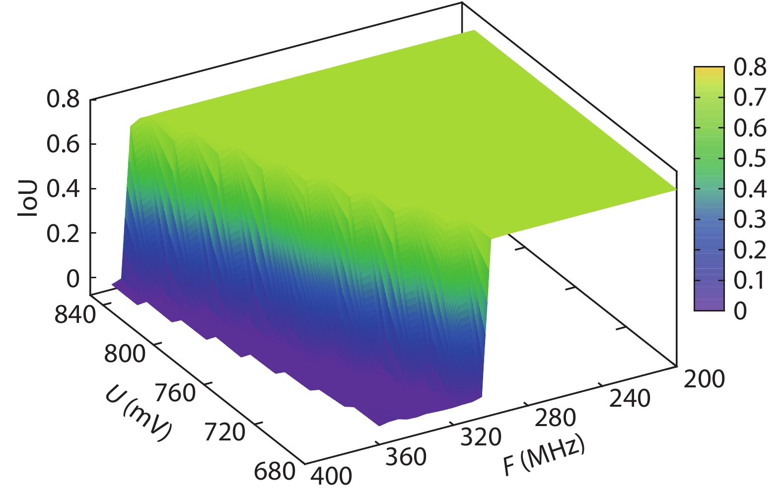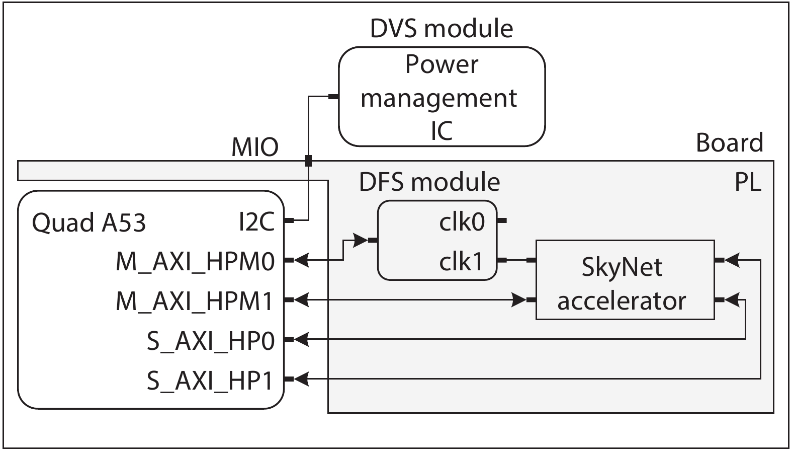 Abstract: On the one hand, accelerating convolution neural networks (CNNs) on FPGAs requires ever increasing high energy efficiency in the edge computing paradigm. On the other hand, unlike normal digital algorithms, CNNs maintain their high robustness even with limited timing errors. By taking advantage of this unique feature, we propose to use dynamic voltage and frequency scaling (DVFS) to further optimize the energy efficiency for CNNs. First, we have developed a DVFS framework on FPGAs. Second, we apply the DVFS to SkyNet, a state-of-the-art neural network targeting on object detection. Third, we analyze the impact of DVFS on CNNs in terms of performance, power, energy efficiency and accuracy. Compared to the state-of-the-art, experimental results show that we have achieved 38% improvement in energy efficiency without any loss in accuracy. Results also show that we can achieve 47% improvement in energy efficiency if we allow 0.11% relaxation in accuracy.