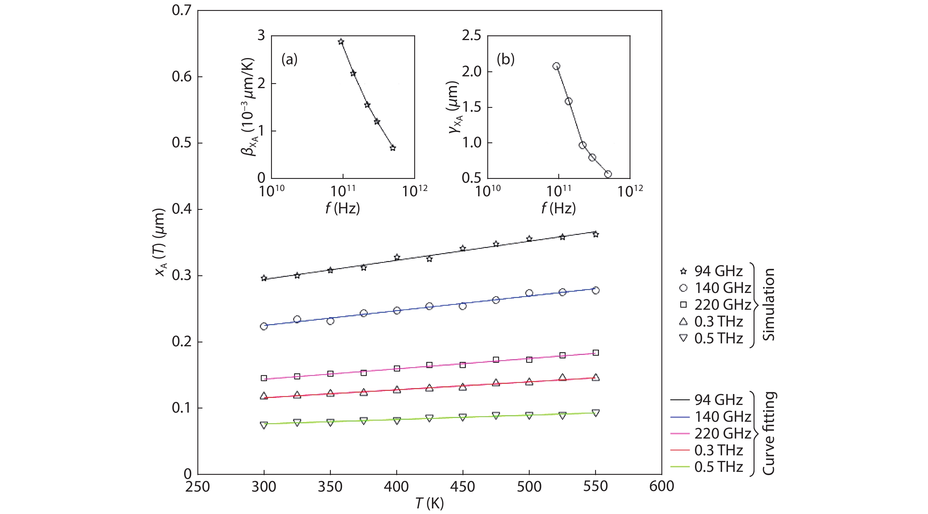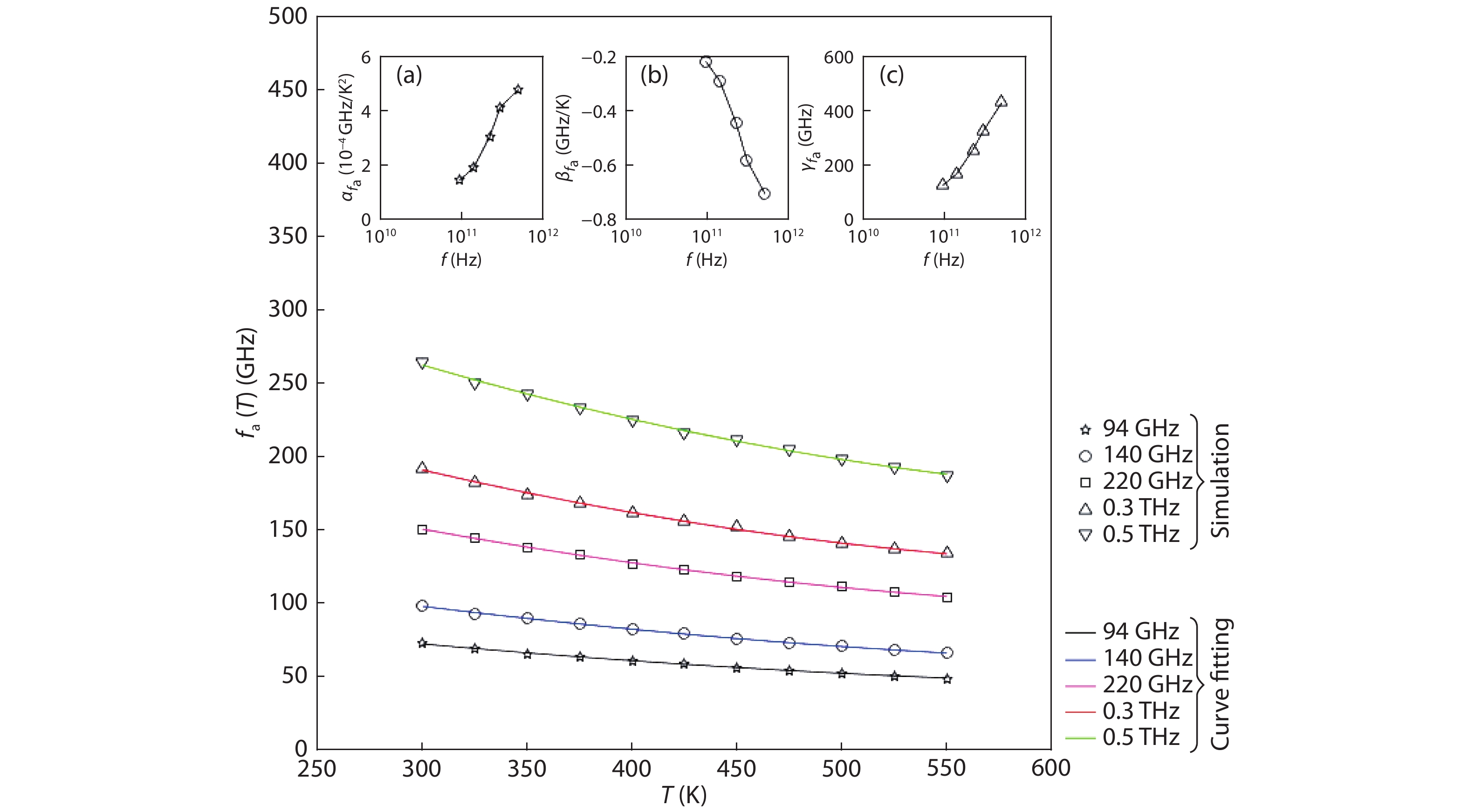 Table 3. Quadratic temperature coefficient, linear temperature coefficient and constant fitting parameter associated with large-signal parameters such as fa, fp and Gp for the temperature range of 300–550 K.