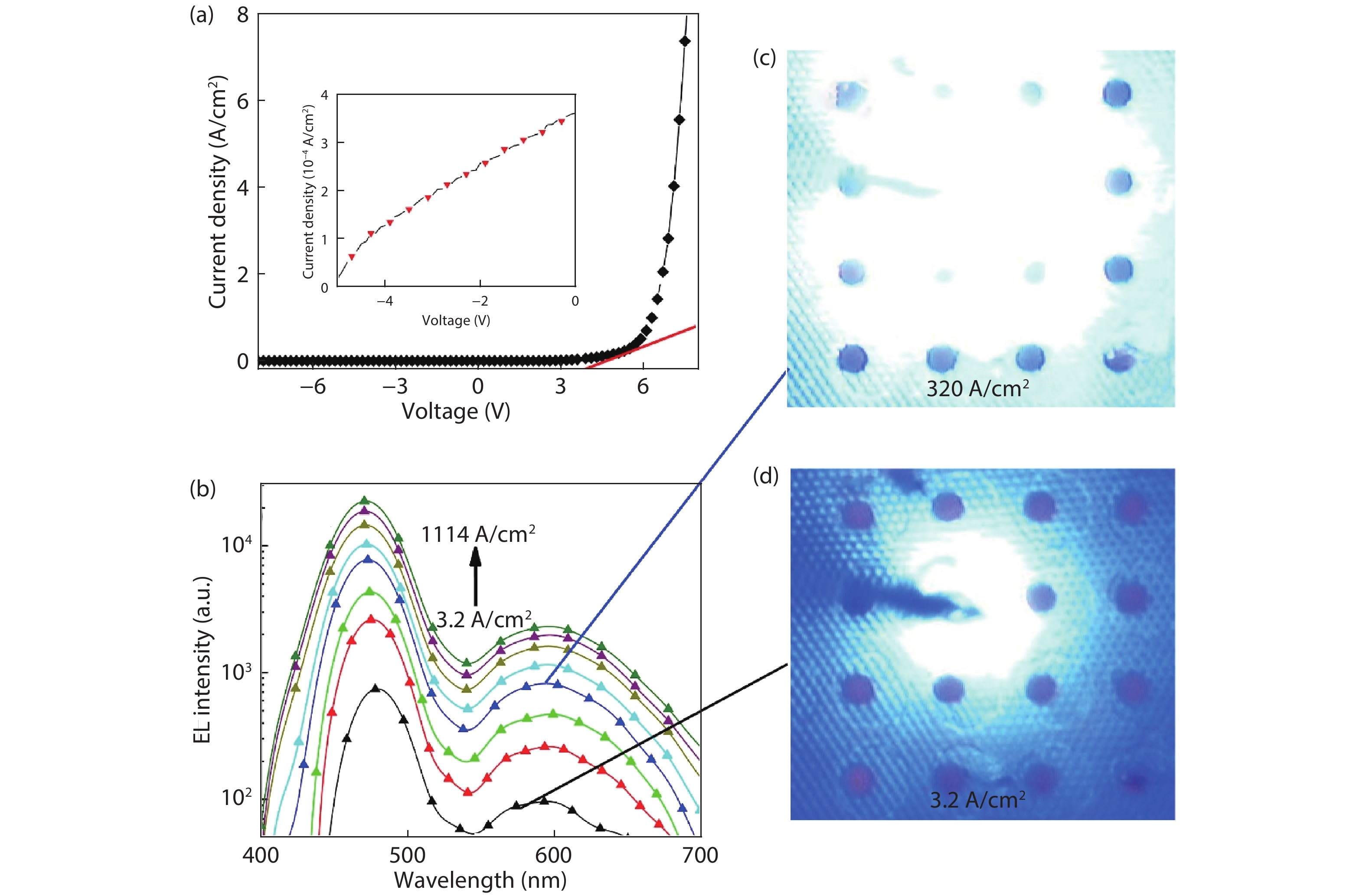 Abstract: Hybrid white micro-pillar structure light emitting diodes (LEDs) have been manufacture utilizing blue micro-LEDs arrays integrated with 580 nm CIS ((CuInS2-ZnS)/ZnS) core/shell quantum dots. The fabricated hybrid white micro-LEDs have good electrical properties, which are manifested in relatively low turn-on voltage and reverse leakage current. High-quality hybrid white light emission has been demonstrated by the hybrid white micro-LEDs after a systemic optimization, in which the corresponding color coordinates are calculated to be (0.3303, 0.3501) and the calculated color temperature is 5596 K. This result indicates an effective way to achieve high-performance white LEDs and shows great promise in a large range of applications in the future including micro-displays, bioinstrumentation and visible light communication.