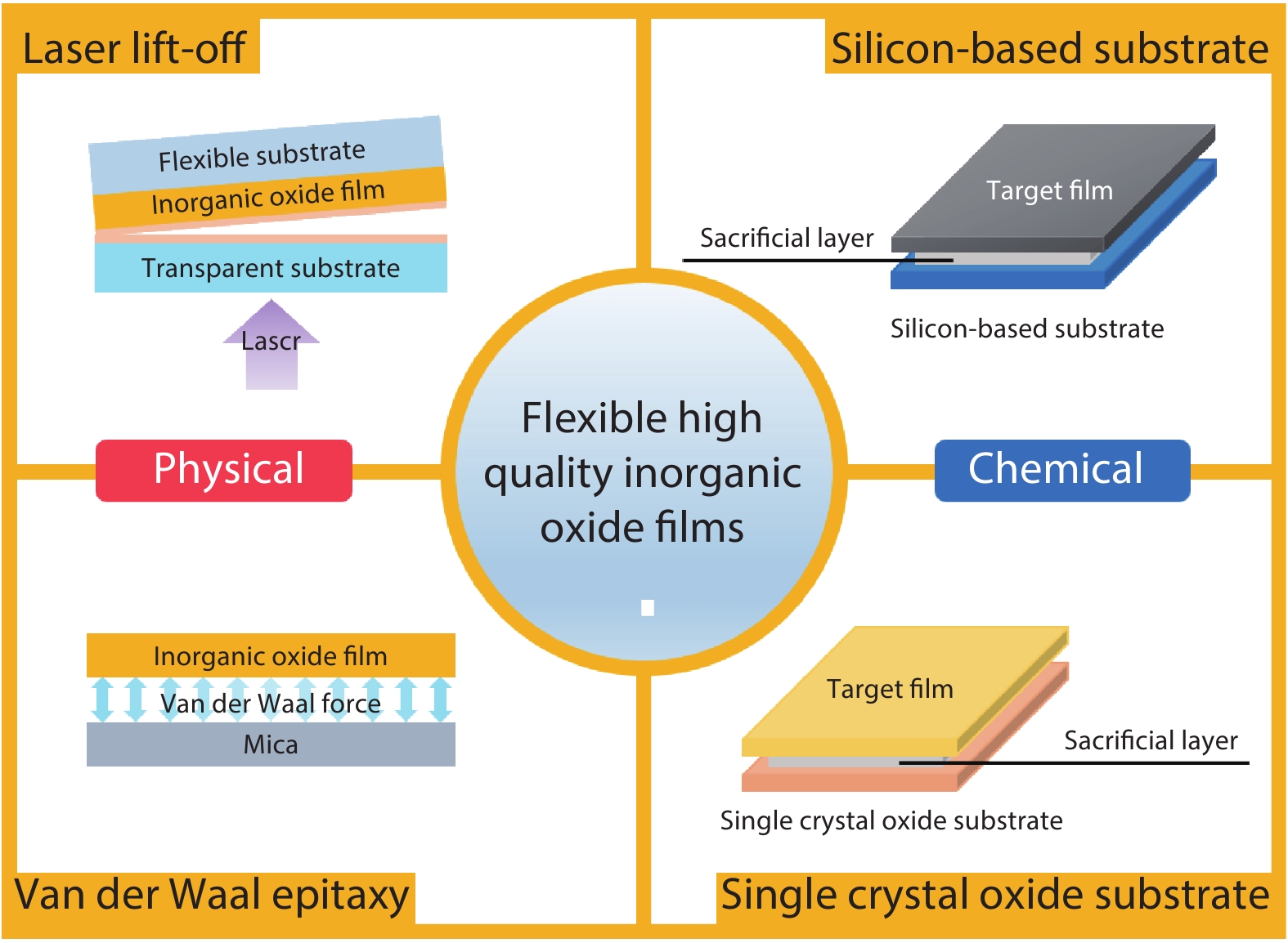 Abstract: With the advent of human-friendly intelligent life, as well as increasing demands for natural and seamless human-machine interactions, flexibility and wearability are among the inevitable development trends for electronic devices in the future. Due to the advantages of rich physicochemical properties, flexible and stretchable inorganic oxide thin-film electronics play an increasingly important role in the emerging and exciting flexible electronic field, and they will act as a critical player in next-generation electronics. However, a stable strategy to render flexibility while maintaining excellent performance of oxide thin films is the most demanding and challenging problem, both for academic and industrial communities. Thus, this review focuses on the latest advanced strategies to achieve flexible inorganic oxide thin-film electronics. This review emphasizes the physical transferring strategies that are based on mechanical peeling and the chemical transferring strategies that are based on sacrificial layer etching. Finally, this review evaluates and summarizes the merits and demerits of these strategies toward actual applications, concluding with a future perspective into the challenges and opportunities for the next-generation of flexible inorganic oxide thin-film electronics.