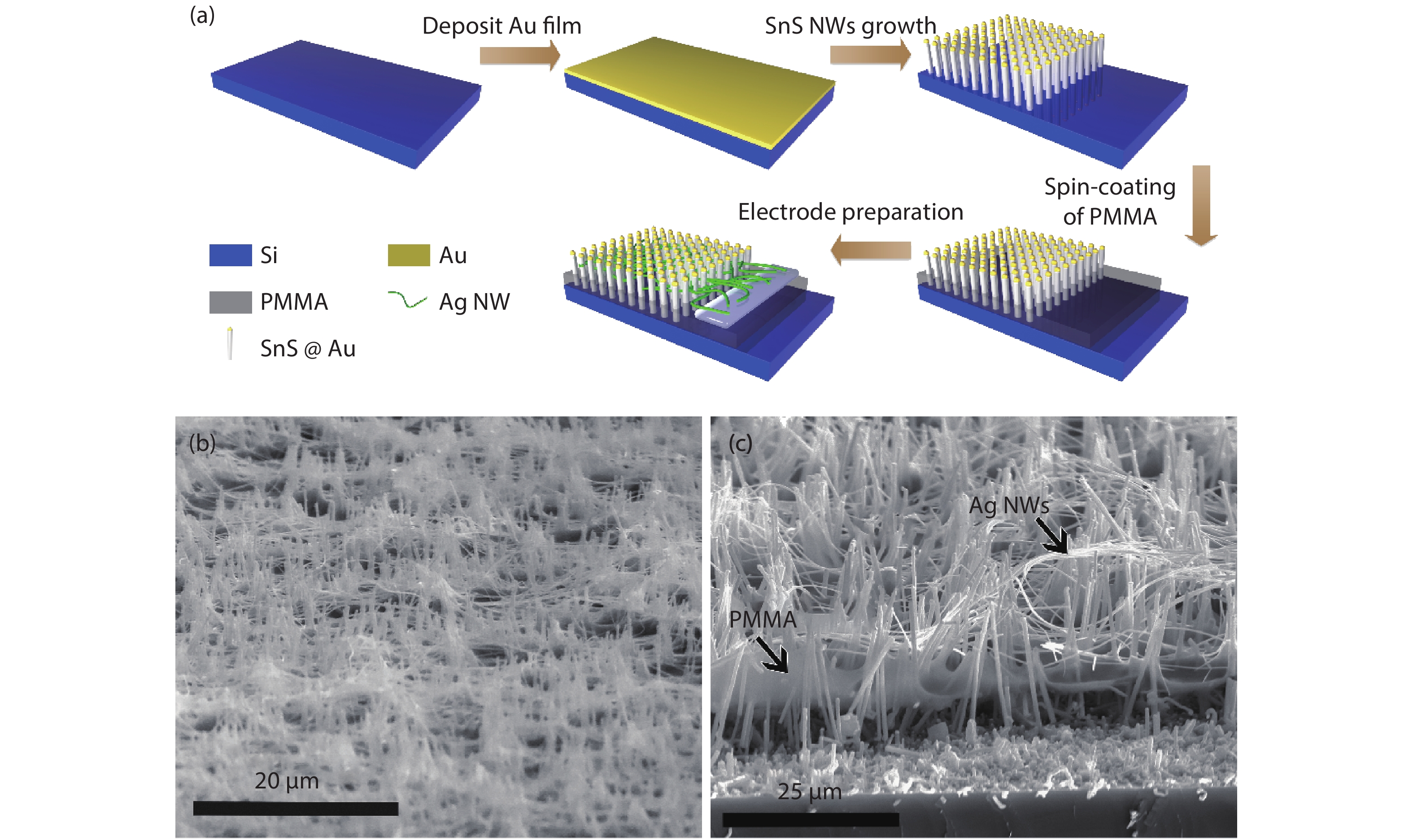 Abstract: Aligned SnS nanowires arrays were grown via a simple chemical vapor deposition method. As-synthesized SnS nanowires are single crystals grown along the [111] direction. The single SnS nanowire based device showed excellent response to near infrared lights with good responsivity of 267.9 A/W, high external quantum efficiency of 3.12 × 104 % and fast response time. Photodetectors were built on the aligned SnS nanowire arrays, exhibiting a light on/off ratio of 3.6, and the response and decay time of 4.5 and 0.7 s, respectively, to 1064 nm light illumination.