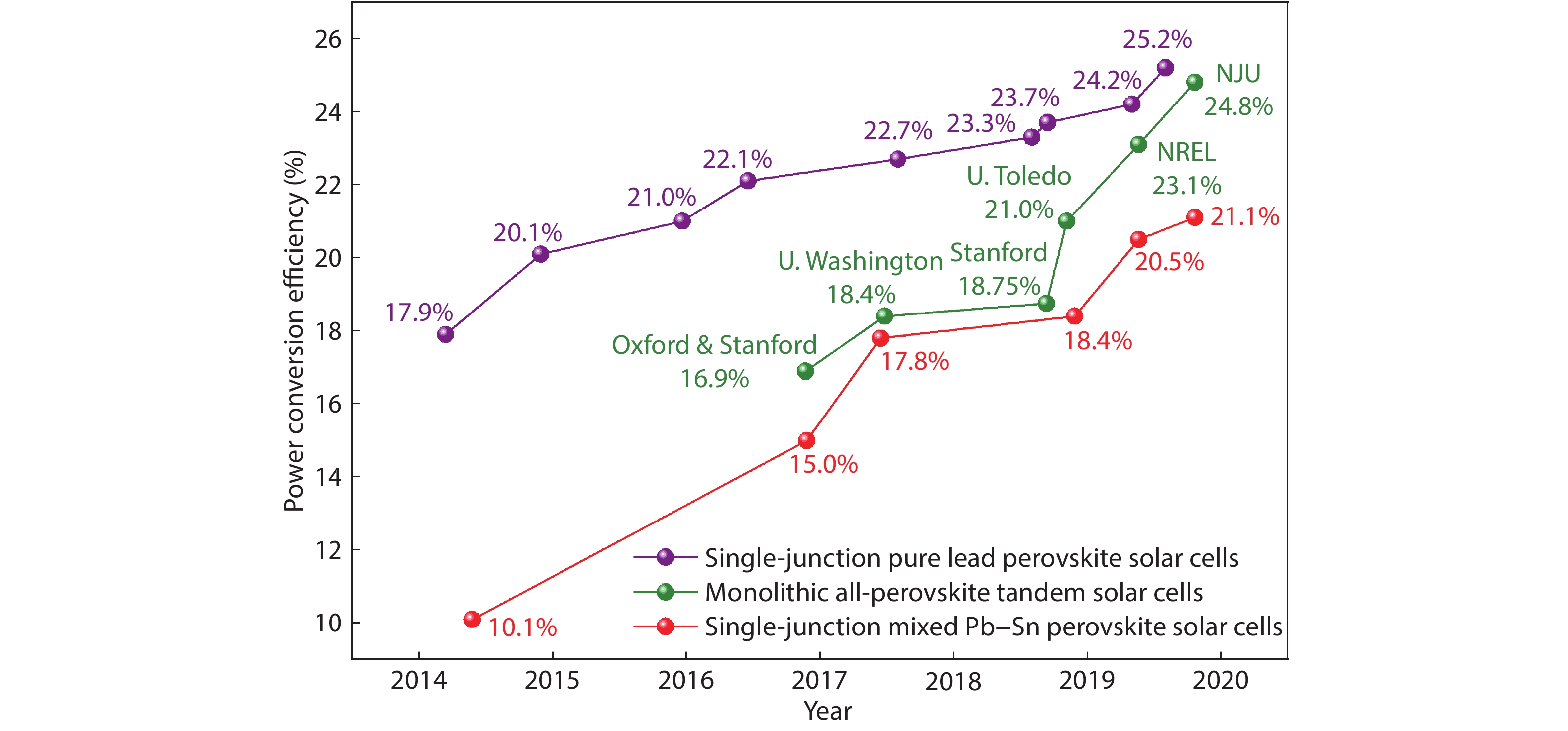 Lin R, Xiao K, Qin Z, et al. Monolithic all-perovskite tandem solar cells with 24.8% efficiency exploiting comproportionation to suppress Sn (II) oxidation in precursor ink. Nat Energy, 2019, 4(10), 864 doi: 10.1038/s41560-019-0466-3