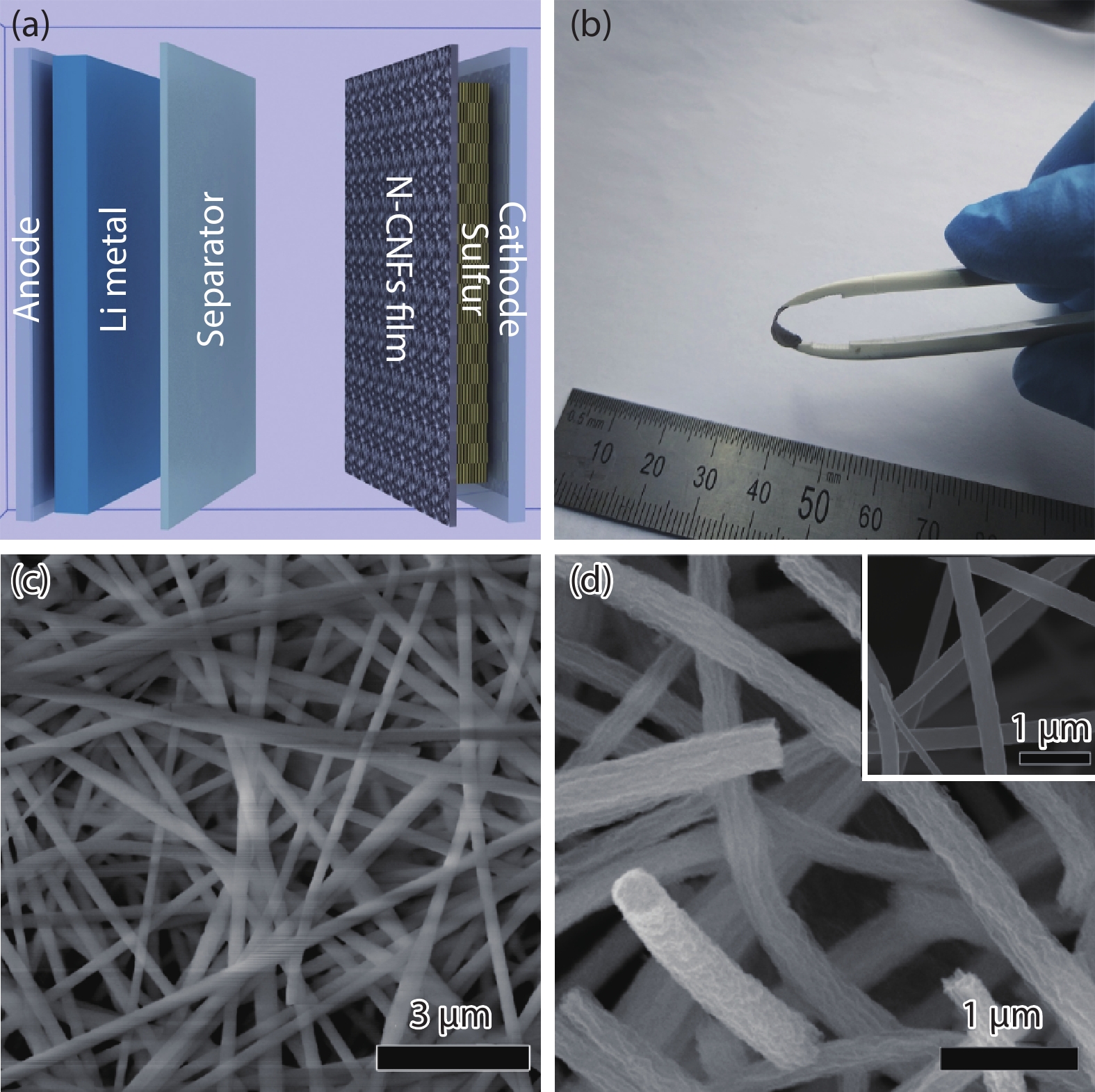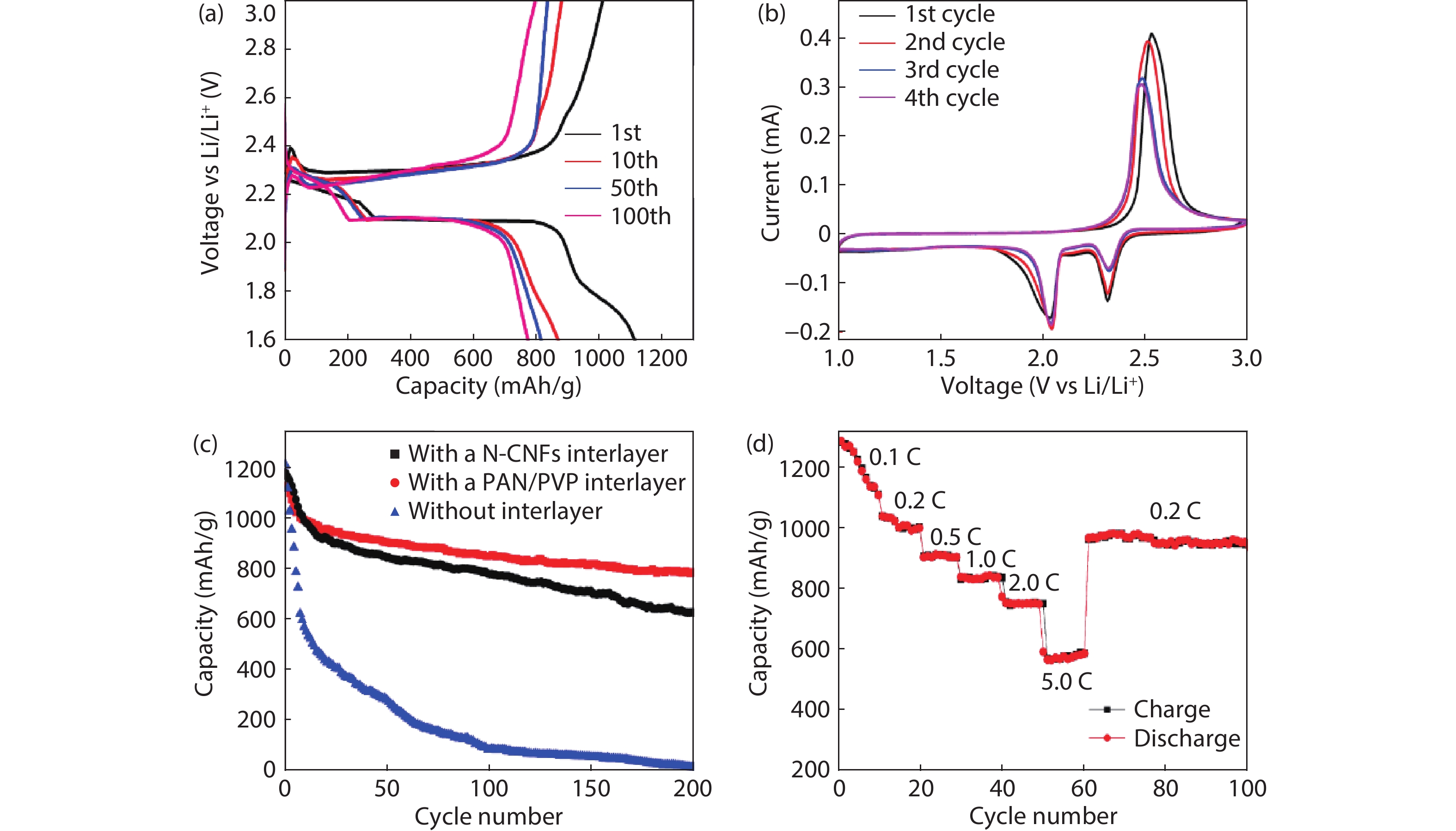 Abstract: Lithium–sulfur (Li–S) battery with a new configuration is demonstrated by inserting a flexible nitrogen-doping carbon nanofiber (N-CNFs) interlayer between the sulfur cathode and the separator. The N-CNFs film with high surface roughness and surface area is fabricated by electrospinning and a subsequent calcination process. The N-CNFs film interlayer not only effectively traps the shuttling migration of polysulfides but also gives the whole battery reliable electronic conductivity, which can effectively enhance the electrochemical performance of Li–S batteries. Finally, Li–S batteries with long cycling stability of 785 mAh/g after 200 cycles and good rate capability of 573 mAh/g at 5 C are achieved.