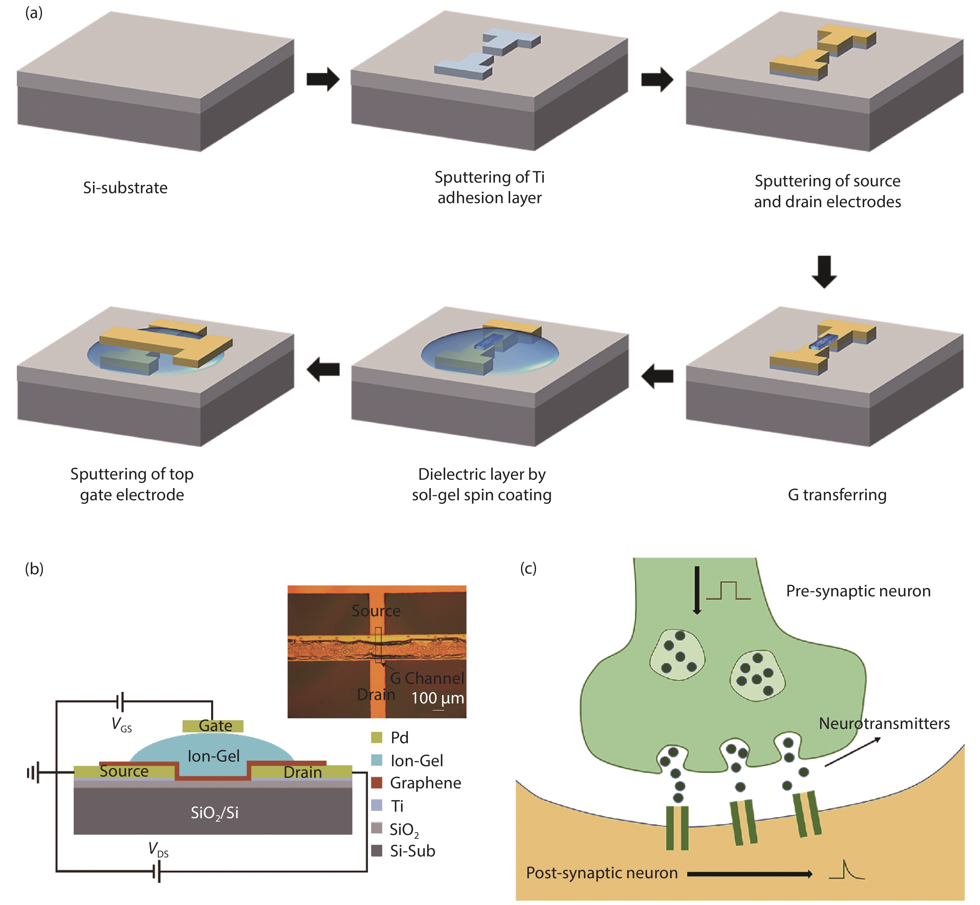 Abstract: Multi-terminal electric-double-layer transistors have recently attracted extensive interest in terms of mimicking synaptic and neural functions. In this work, an Ion-Gel gated graphene synaptic transistor was proposed to mimic the essential synaptic behaviors by exploiting the bipolar property of graphene and the ionic conductivity of Ion-Gel. The Ion-Gel dielectrics were deposited onto the graphene film by the spin coating process. We consider the top gate and graphene channel as a presynaptic and postsynaptic terminal, respectively. Basic synaptic functions were successfully mimicked, including the excitatory postsynaptic current (EPSC), the effect of spike amplitude and duration on EPSC, and paired-pulse facilitation (PPF). This work may facilitate the application of graphene synaptic transistors in flexible electronics.