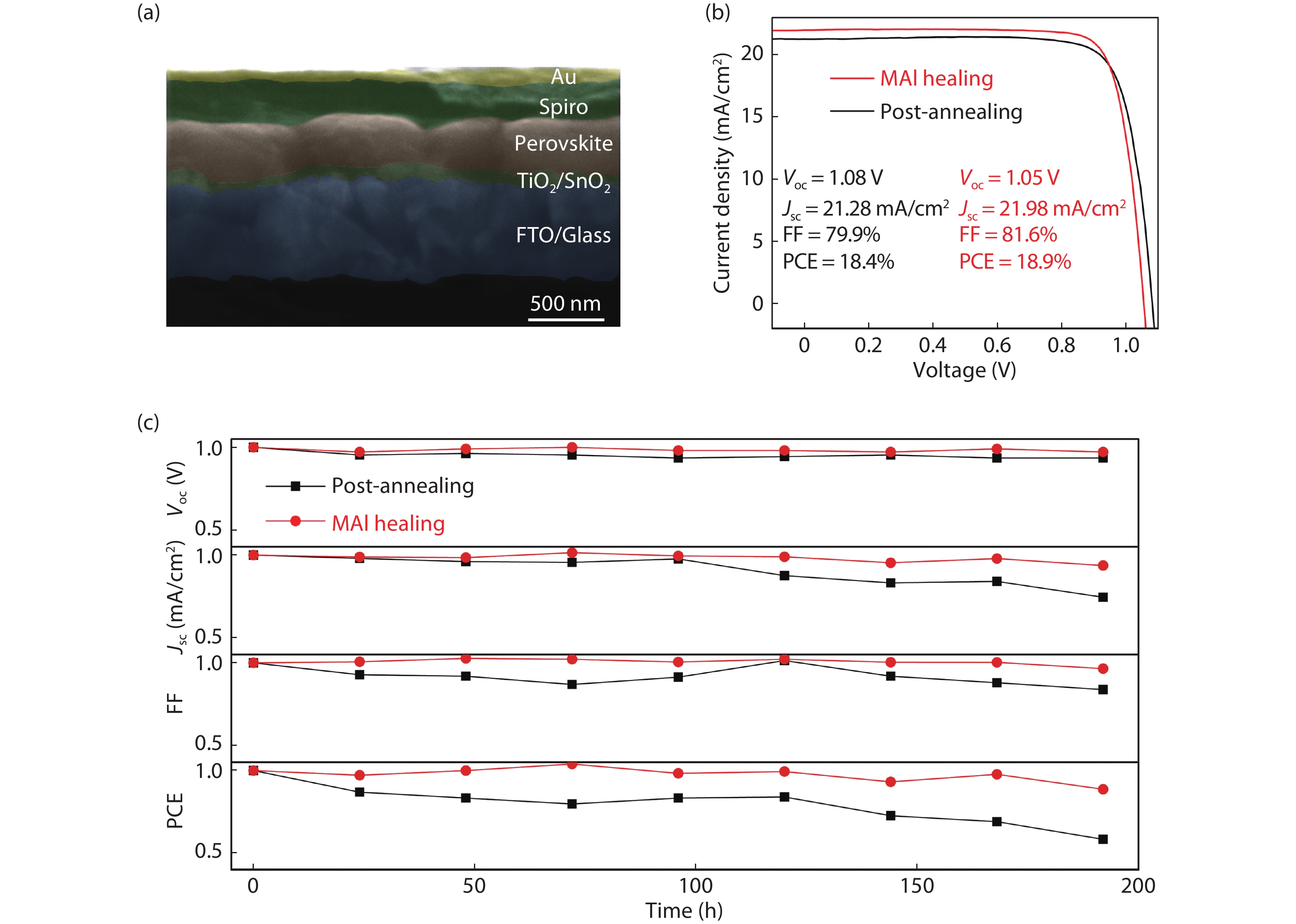 Abstract: Repressing the thermal decomposition during the process of heat treatment plays an indispensable part in the preparation of perovskite films. Here, a methylammonium iodide healing method was applied to prevent the volatilization of the organic component inside the perovskite structure during the heat treatment. High-quality CH3NH3PbI3 film with a much larger grain size over 800 nm was successfully fabricated via this healing method. Besides, the absorption and photoluminescence intensity were also both improved. Finally, the best power conversion efficiency of 18.89% with a fill factor over 80% was realized in an n–i–p configuration while possessing outstanding stability. This work suggests that methylammonium iodide healing method is a reliable way to promote crystal growth and improve the photovoltaic performance and humidity stability of the CH3NH3PbI3 solar cells.