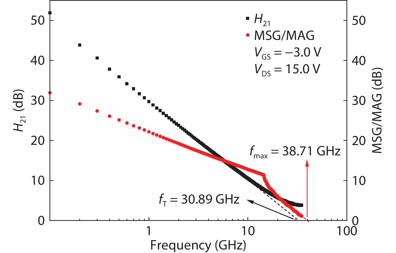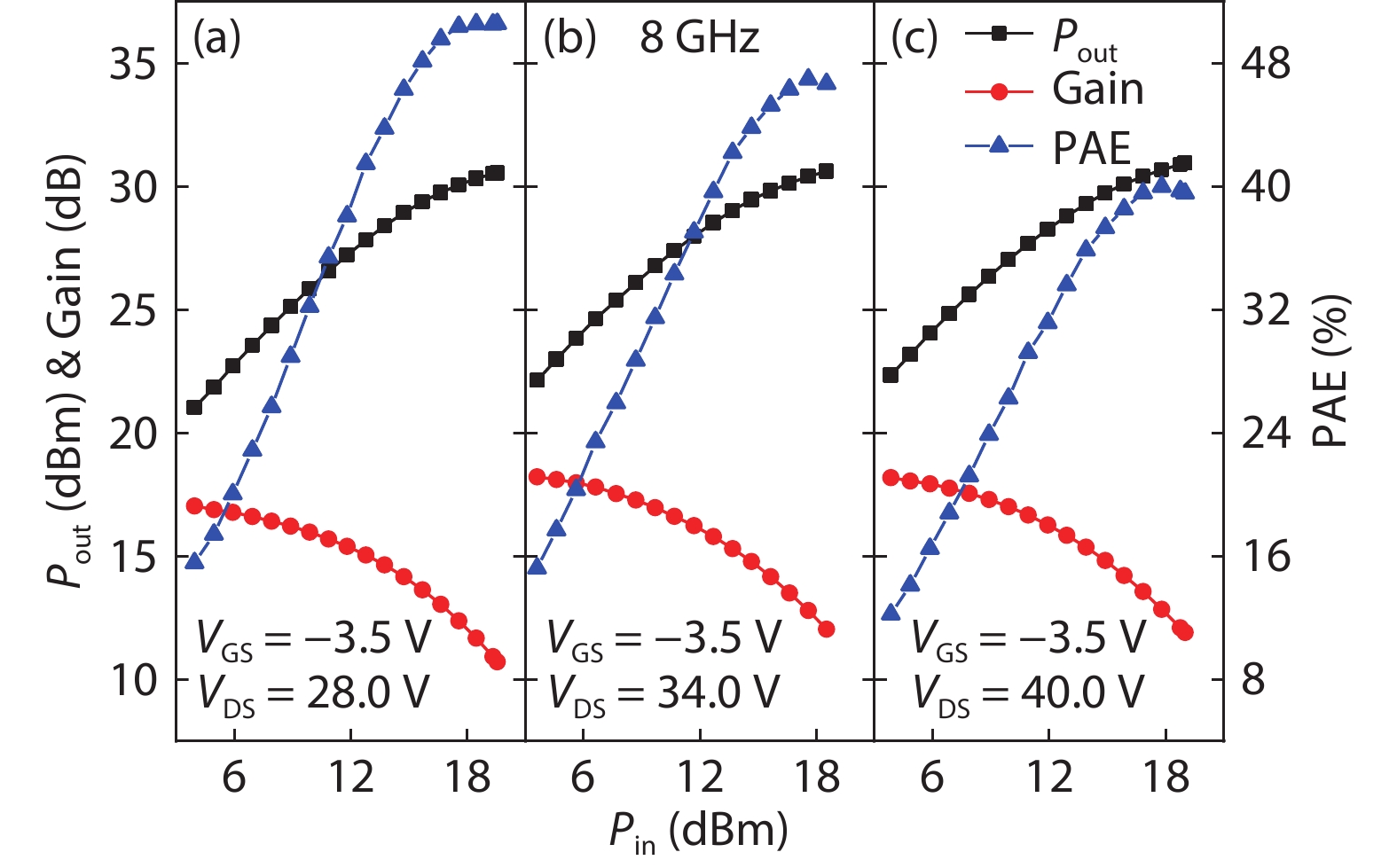 | DC bias (VGS, VDS) (V) | Pout (max) (dBm) | Pin (dBm) | G (dB) | PAE (%) | G (compression) (dB) | G (linear) (dB) | Pout density (saturated) (W/mm) |