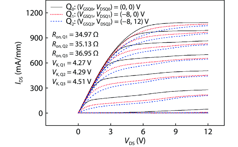 | DC bias (VGS, VDS) (V) | VDS ? VK (V) | PDC (W/mm) | PRF (W/mm) (VK = 4.2 V) | ηD (%) |