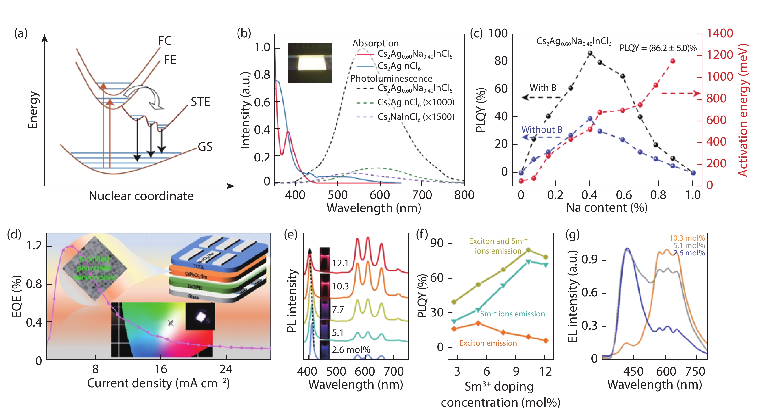 Fig. 1.  (Color online) (a) A schematic illustration of STE emission. FC, free carrier state; FE, free exciton state; STE, self-trapped exciton state; GS, ground state. Reproduced with permission[12], Copyright 2020, Nature Publishing Group. (b) Absorption (solid lines) and photoluminescence (dashed lines) spectra for Cs2AgInCl6 and Cs2Ag0.60Na0.40InCl6. (c) Activation energy and PLQY of Cs2AgxNa1–xInCl6 powder vs Na content. Reproduced with permission[9], Copyright 2018, Nature Publishing Group. (d) External quantum efficiency (EQE) of CsPbCl3:Sm3+-based WLED. The inserted pictures are the structure of the device, the transmission electron microscopy (TEM) image of Sm3+-doped CsPbCl3 perovskite quantum dots, and the photo of a working WLED. (e) Emission spectra of Sm3+-doped CsPbCl3 with different doping content under the excitation of 365 nm. (f) PLQYs as a function of Sm3+ doping content. (g) EL spectra for the LEDs based on Sm3+-doped CsPbCl3 with different doping content. (d)–(g), reproduced with permission[10], Copyright 2020, American Chemical Society.