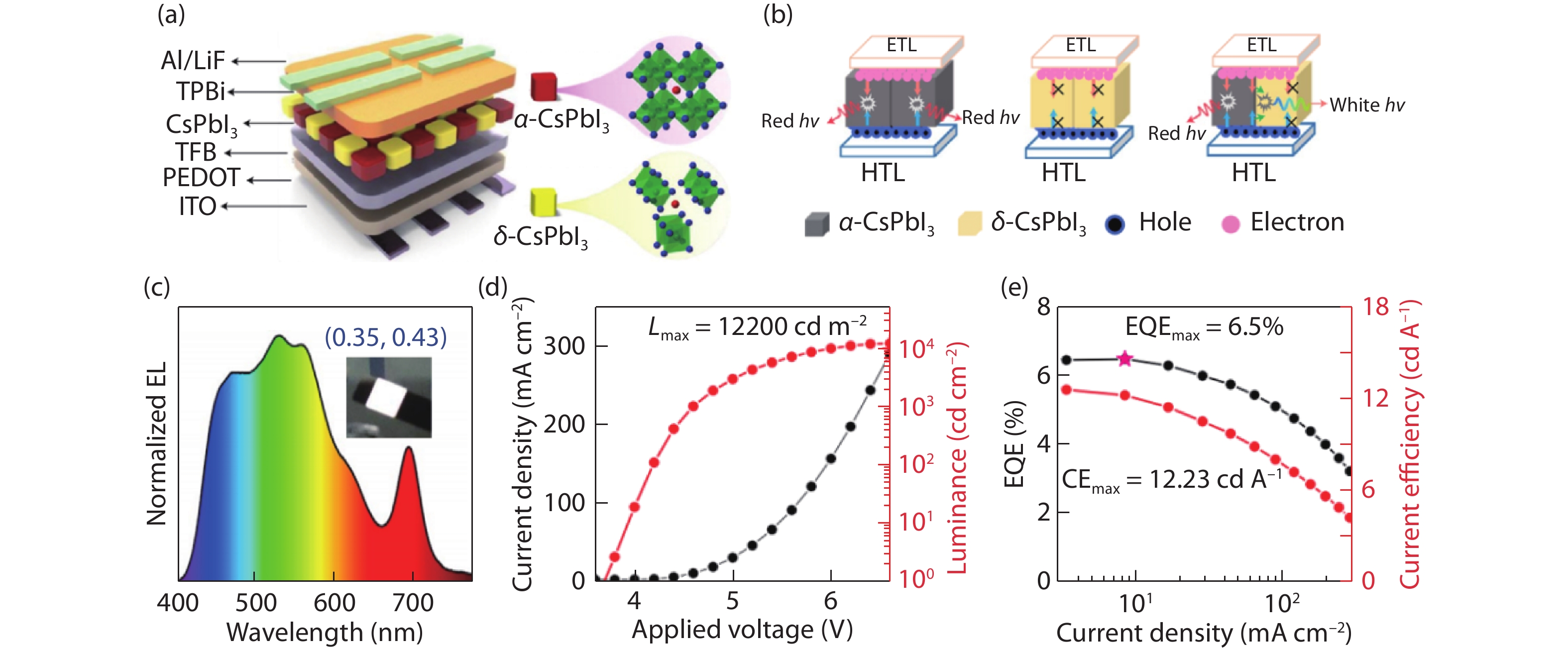 Fig. 2.  (Color online) (a) Structure of the perovskite WLED with an active layer composed of α-CsPbI3 and δ-CsPbI3. (b) The carrier injection and recombination mechanism for the perovskite WLEDs. (c) Electroluminescence spectra. (d) Current density–voltage (JV) curve and luminance–voltage (LV) curve for the perovskite WLEDs. (e) External quantum efficiency and current efficiency of the WLEDs. Reproduced with permission[11], Copyright 2021, Nature Publishing Group.