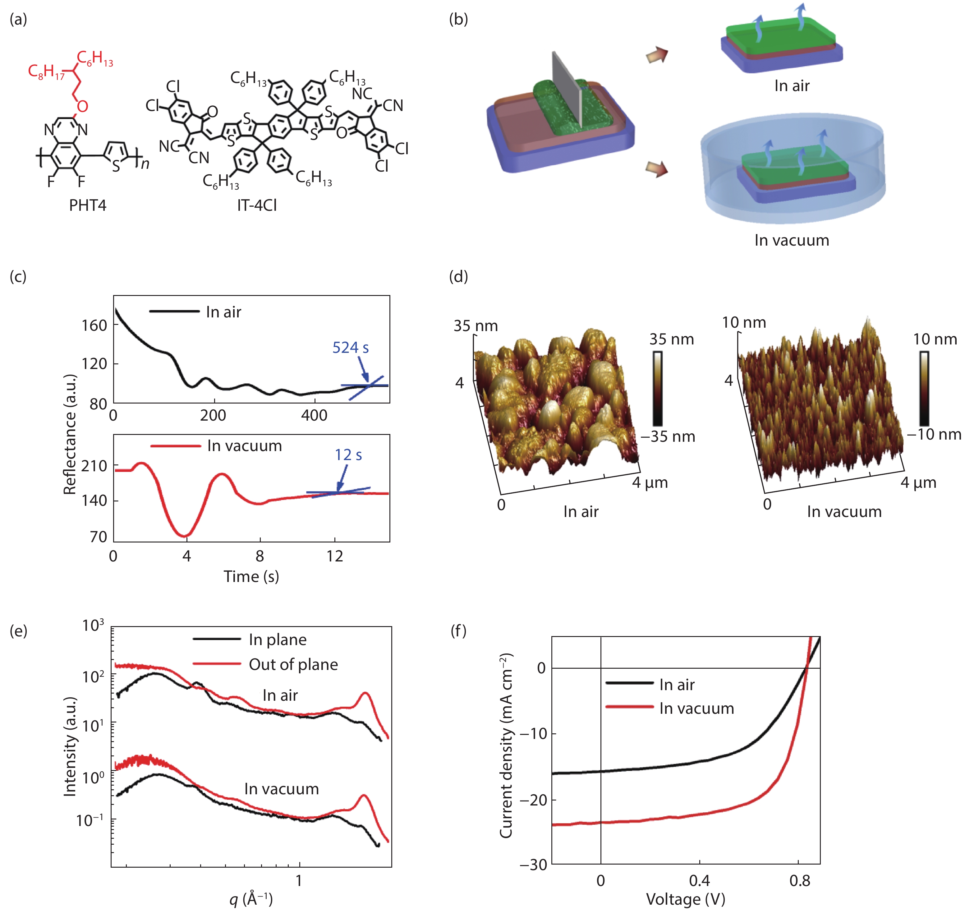 Fig. 1.  (a) Chemical structures of PHT4 and IT-4Cl. (b) Schematic of the blade-coating process with (below) and without (top) vacuum-drying. (c) Light reflectance vs drying time curves for PHT4:IT-4Cl films. (d) AFM images (size: 4 × 4 μm2). (e) Line-cut profiles of GIWAXS along the out-of-plane and in-plane directions. (f) JV curves for devices made with and without vacuum-drying.