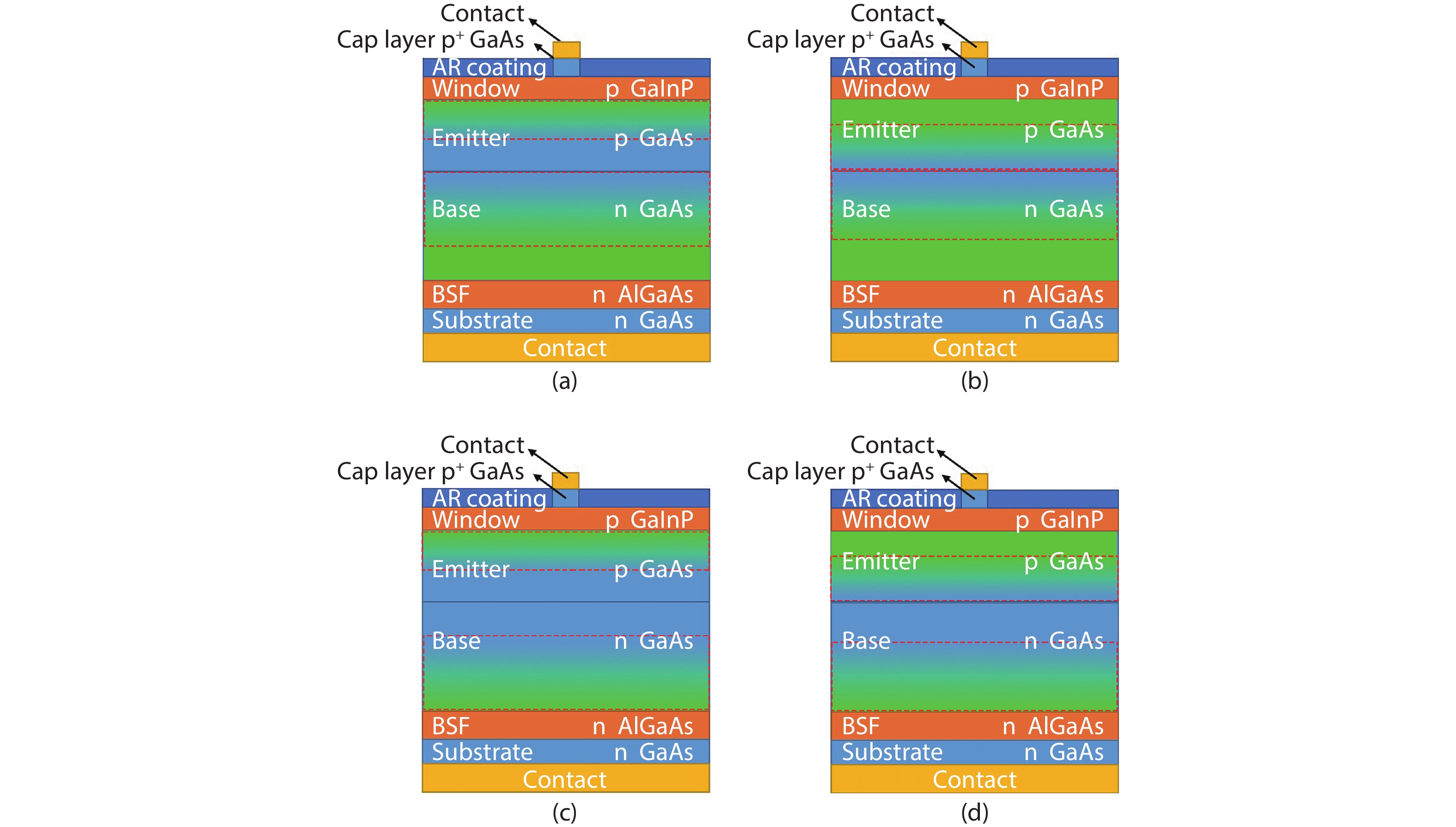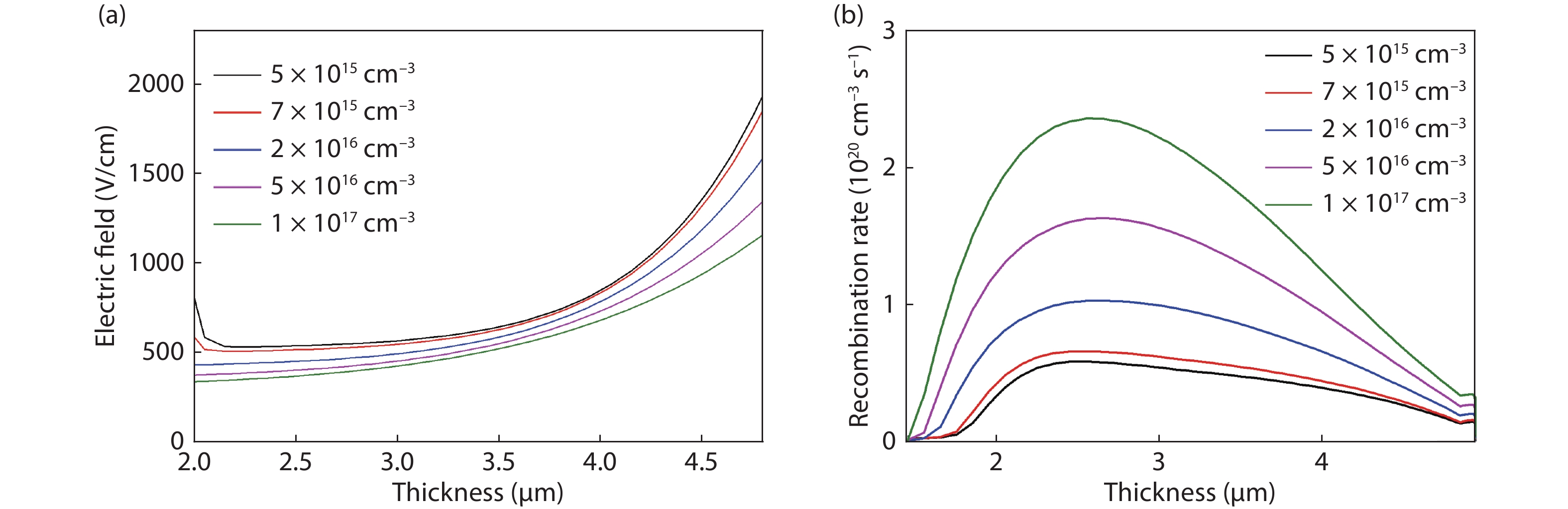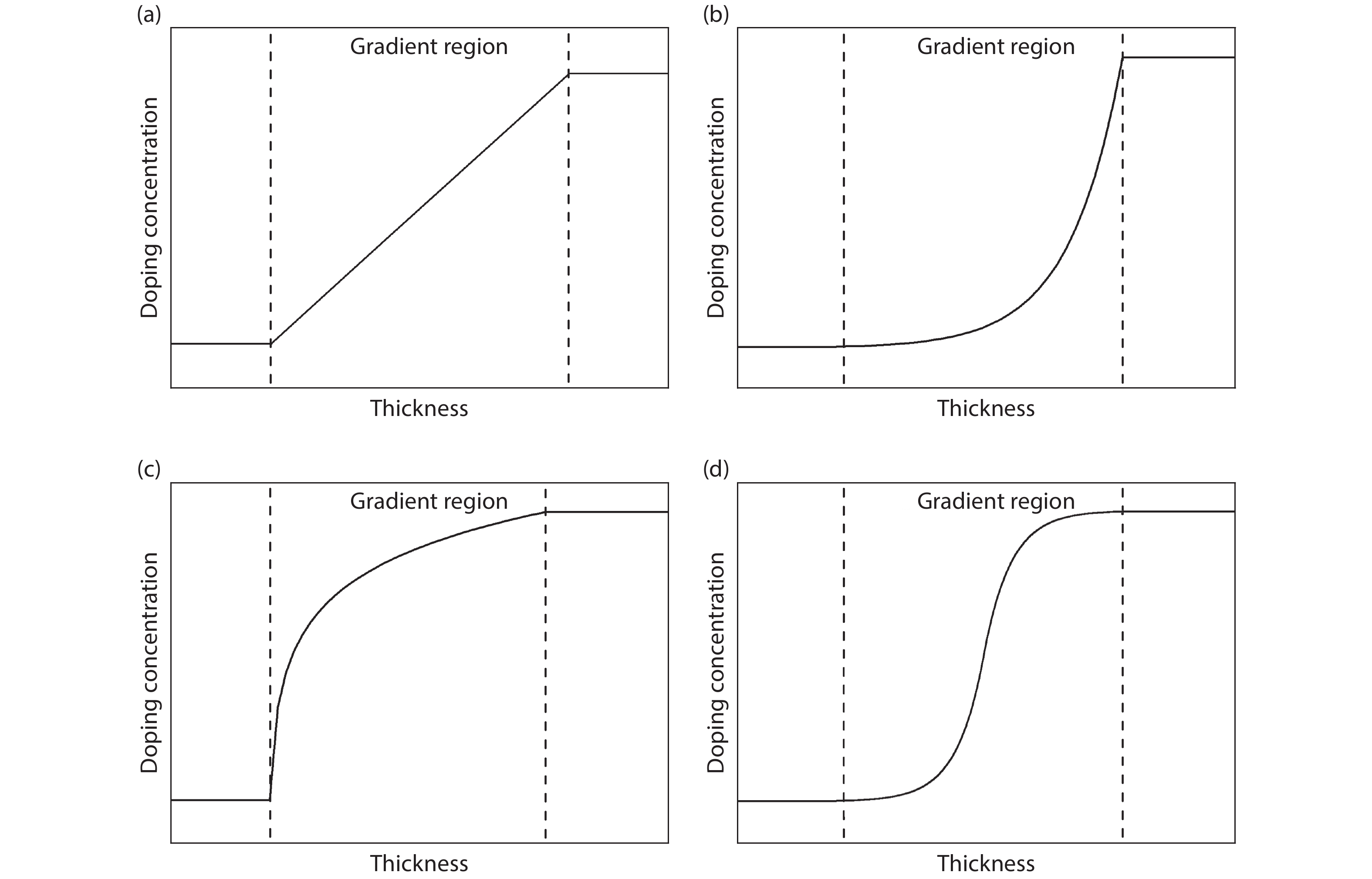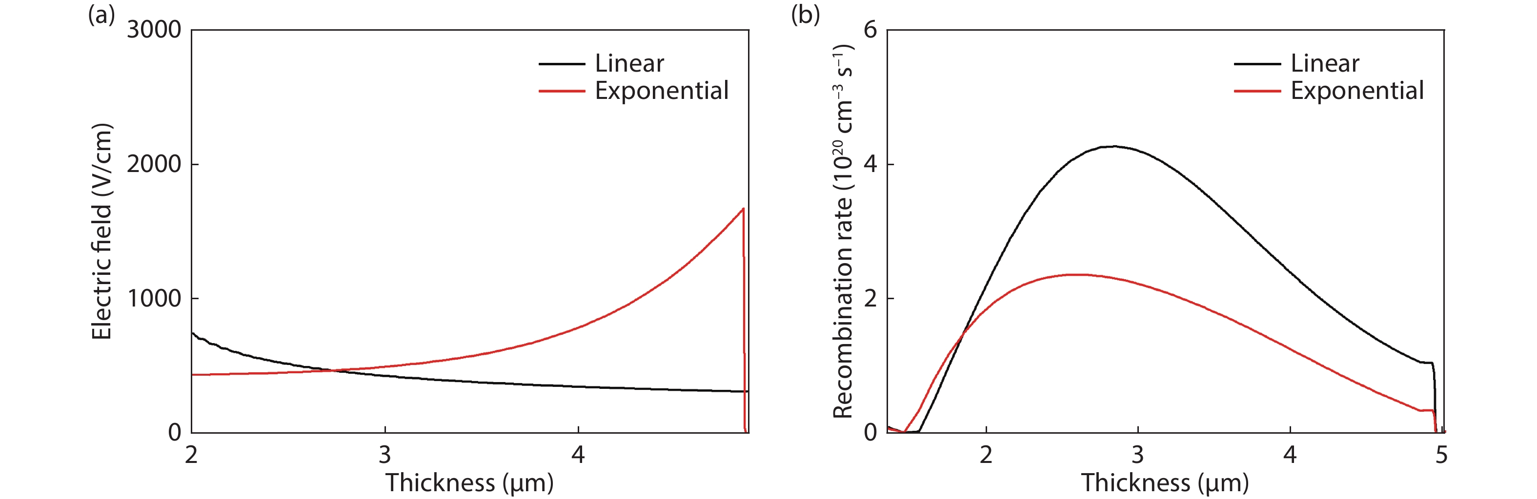 Abstract: The gradient doping regions were employed in the emitter layer and the base layer of GaAs based laser power converters (LPCs). Silvaco TCAD was used to numerically simulate the linear gradient doping and exponential gradient doping structure, and analyze the transport process of photogenerated carriers. Energy band adjustment via gradient doping improved the separation and transport efficiency of photogenerated carriers and reduced the total recombination rate of GaAs LPCs. Compared with traditional structure of LPCs, the photoelectric conversion efficiency of LPCs with linear and exponential gradient doping structure were improved from 52.7% to 57.2% and 57.7%, respectively, under 808 nm laser light at the power density of 1 W/cm2.