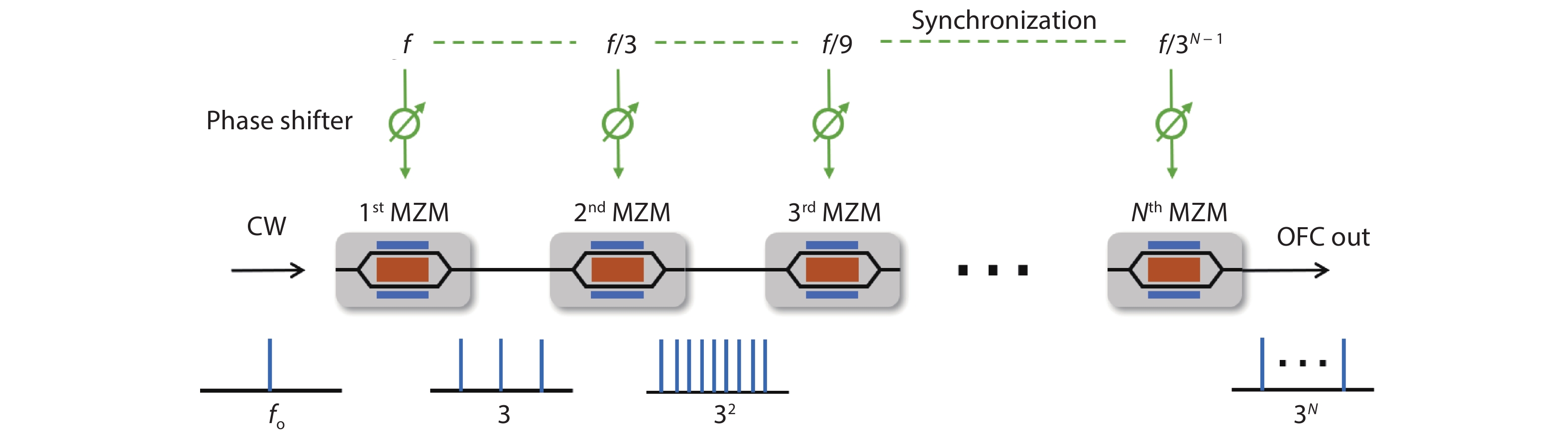 Andriolli N, Cassese T, Chiesa M, et al. Photonic integrated fully tunable comb generator cascading optical modulators. J Lightwave Technol, 2018, 36, 5685 doi: 10.1109/JLT.2018.2877020