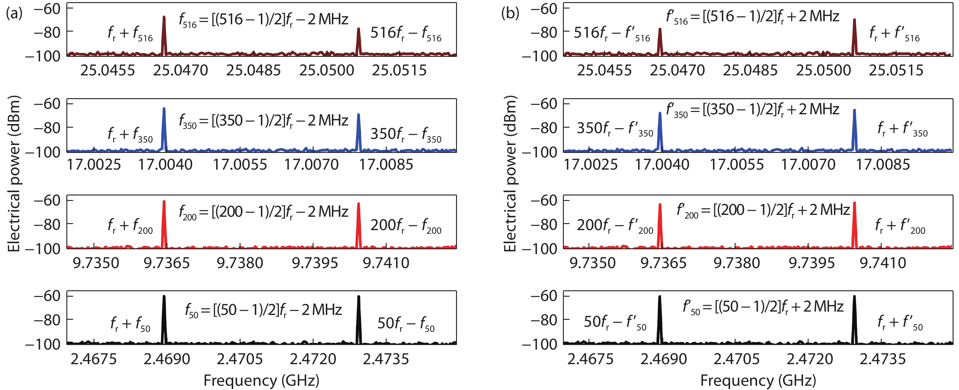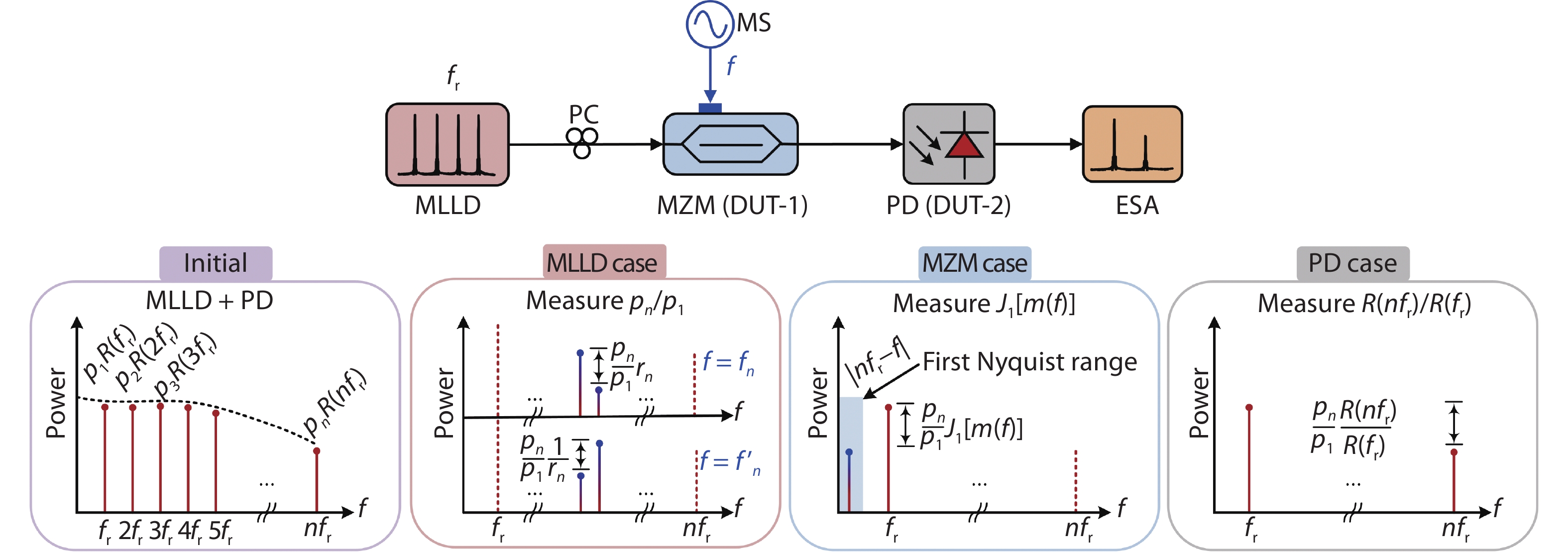 Abstract: We propose a low-speed photonic sampling for independent high-frequency characterization of a Mach–Zehnder modulator (MZM) and a photodetector (PD) in an optical link. A low-speed mode-locked laser diode (MLLD) provides an ultra-wideband optical stimulus with scalable frequency range, working as the photonic sampling source of the link. The uneven spectrum lines of the MLLD are firstly characterized with symmetric modulation within the interesting frequency range. Then, the electro-optic modulated signals are down-converted to the first Nyquist frequency range, yielding the self-referenced extraction of modulation depth and half-wave voltage of the MZM without correcting the responsivity fluctuation of the PD in the link. Finally, the frequency responsivity of the PD is self-referenced measured under null modulation of the MZM. As frequency responses of the MZM and the PD can be independently obtained, our method allows self-referenced high-frequency measurement for a high-speed optical link. In the proof-of-concept experiment, a 96.9 MS/s MLLD is used for measuring a MZM and a PD within the frequency range up to 50 GHz. The consistency between our method and the conventional method verifies that the ultra-wideband and self-referenced high-frequency characterization of high-speed MZMs and PDs.