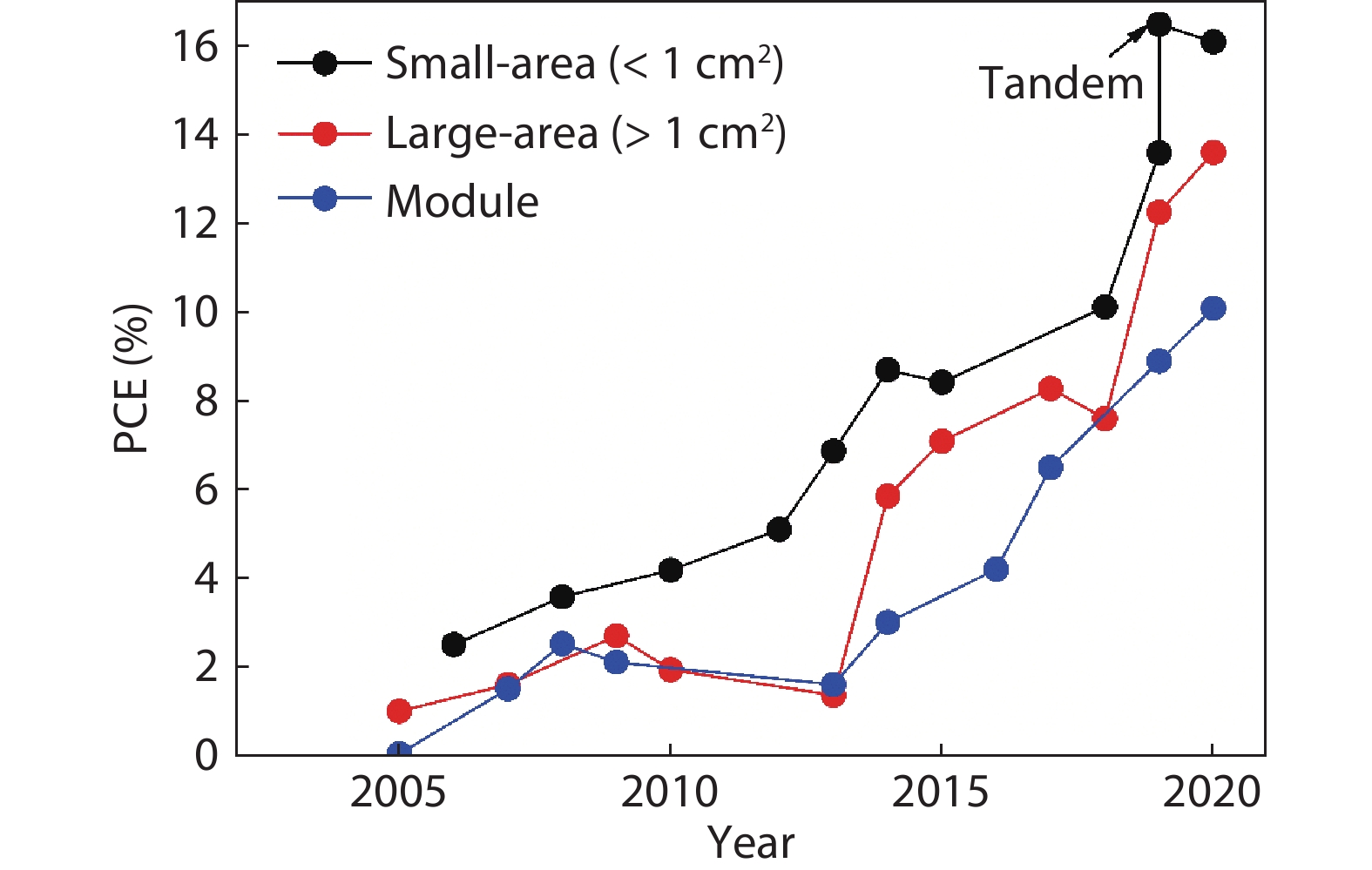 | Year | Area (cm2) | PCE (%) | Electrode | Device structure | Fabrication technique | Ref. |