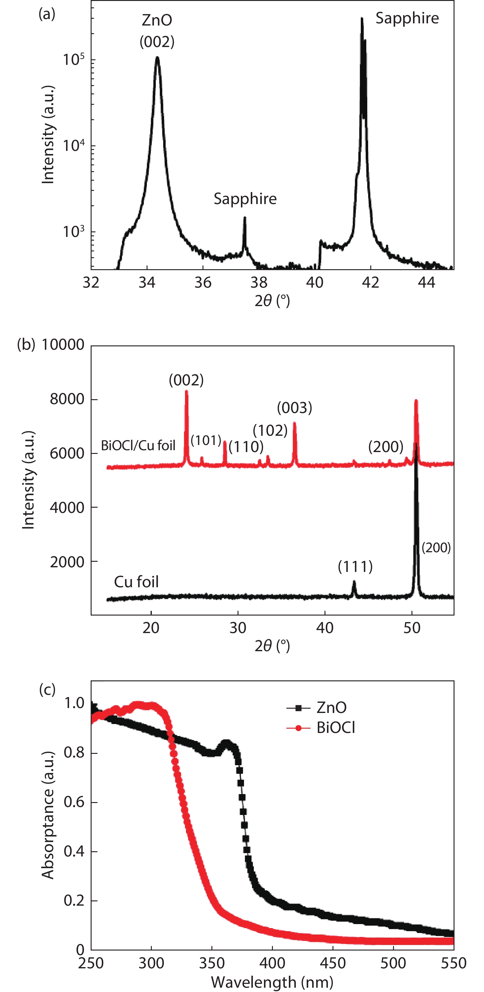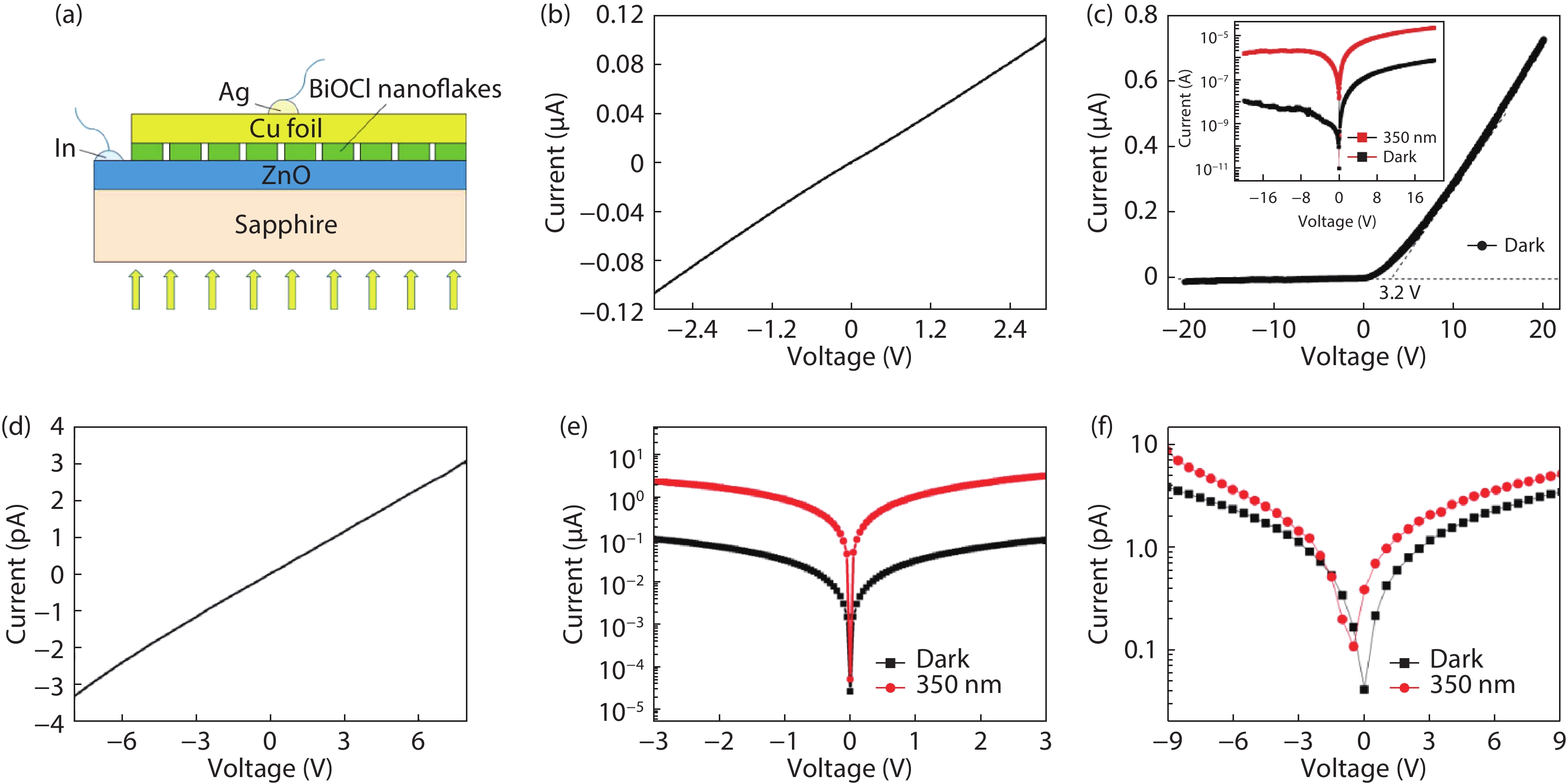 Abstract: Herein, high-quality n-ZnO film layer on c-sapphire and well-crystallized tetragonal p-BiOCl nanoflakes on Cu foil are prepared, respectively. According to the absorption spectra, the bandgaps of n-ZnO and p-BiOCl are confirmed as ~3.3 and ~3.5 eV, respectively. Subsequently, a p-BiOCl/n-ZnO heterostructural photodetector is constructed after a facile mechanical bonding and post annealing process. At –5 V bias, the photocurrent of the device under 350 nm irradiation is ~800 times higher than that in dark, which indicates its strong UV light response characteristic. However, the on/off ratio of In–ZnO–In photodetector is ~20 and the Cu–BiOCl–Cu photodetector depicts very weak UV light response. The heterostructure device also shows a short decay time of 0.95 s, which is much shorter than those of the devices fabricated from pure ZnO thin film and BiOCl nanoflakes. The p-BiOCl/n-ZnO heterojunction photodetector provides a promising pathway to multifunctional UV photodetectors with fast response, high signal-to-noise ratio, and high selectivity.