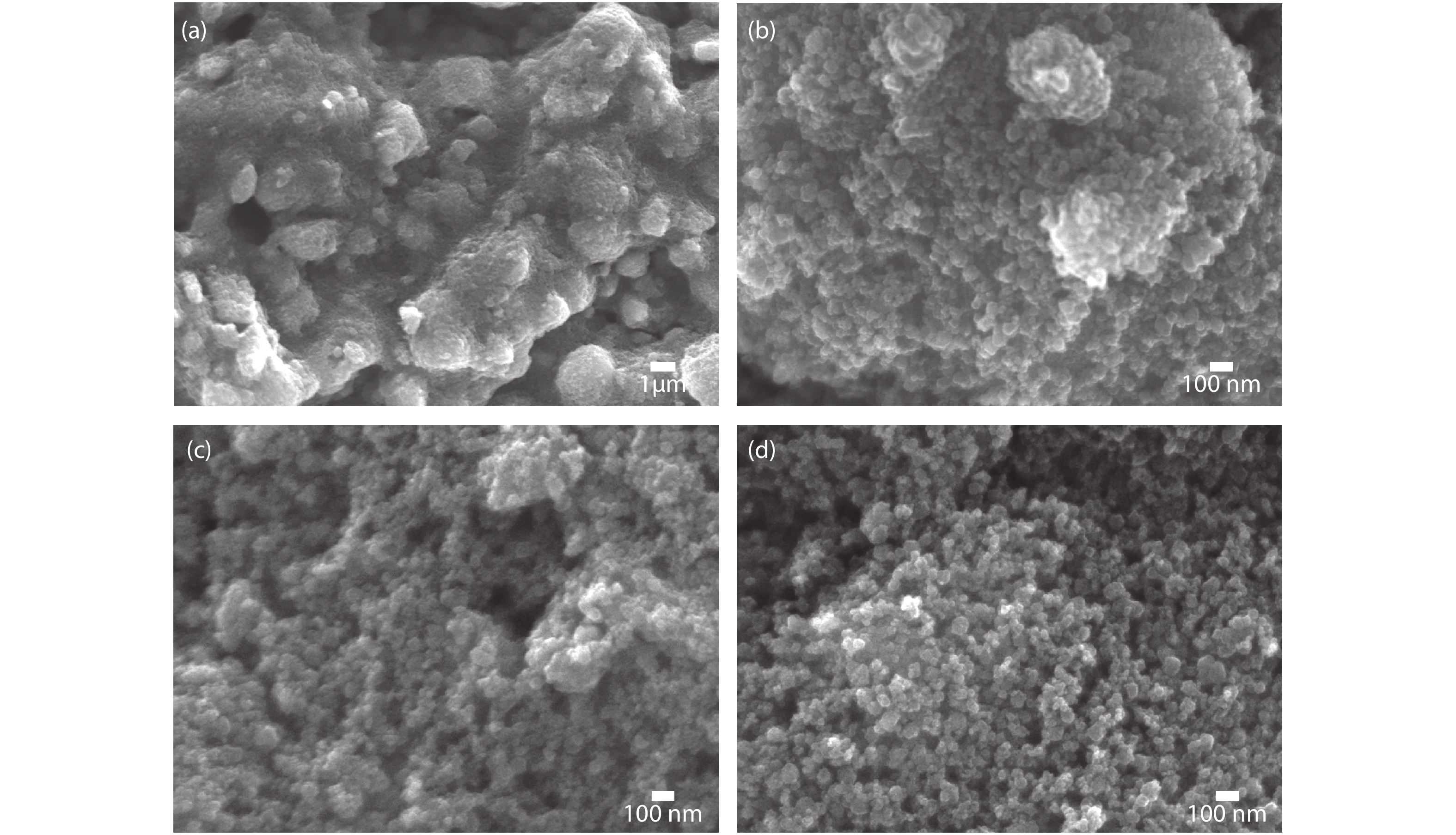 Fig. 1.  Surface morphology of pristine TiO2 at the magnifications of (a) 1000× and (b) 40 000× showing macroscopic clusters and agglomerated particles respectively, (c, d) WO3 coated TiO2 nanoparticles layer showing randomly distributed TiO2 nanoparticles and the porous nature.