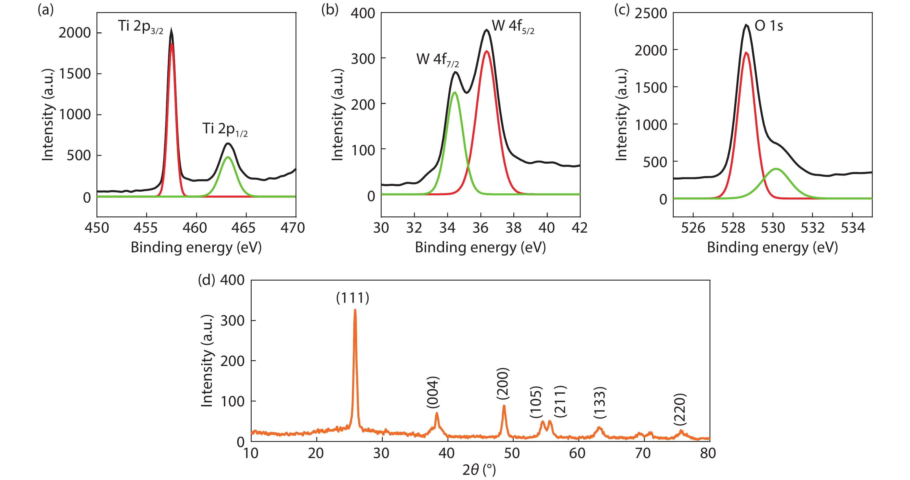 Fig. 2.  (Color online) (a–c) High resolution XPS scans showing Ti 2p, W 4f and O 1s peaks from the WO3 coated TiO2 sample. (d) XRD pattern obtained from the same sample.