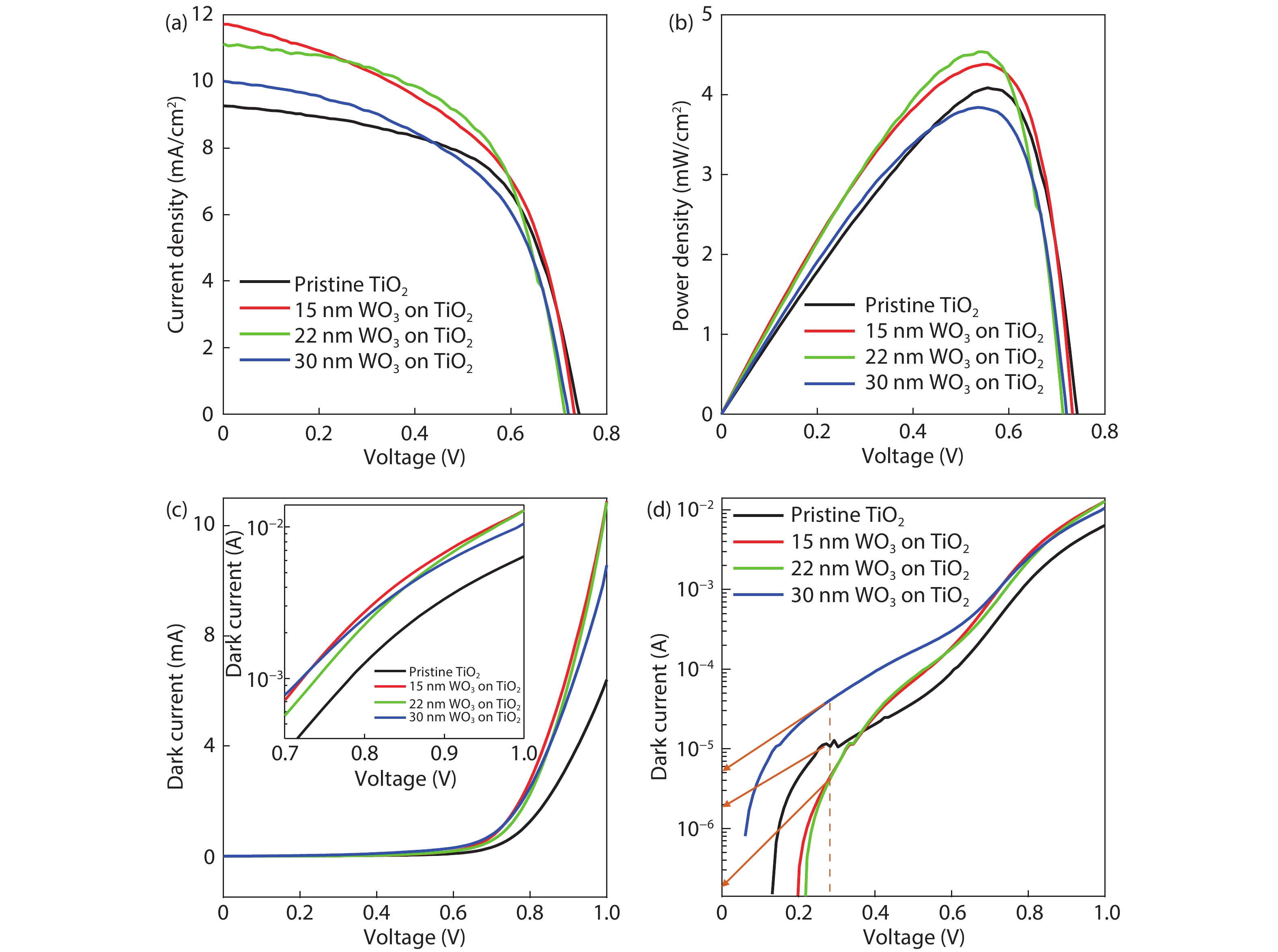 Fig. 4.  (Color online) (a) JV characteristics of the DSSC with and without WO3 passivation on TiO2. (b) Comparison of PMAX of DSSCs, dark current characteristics of DSSCs in (c) linear and (d)semi-log scale showing the saturation current values.
