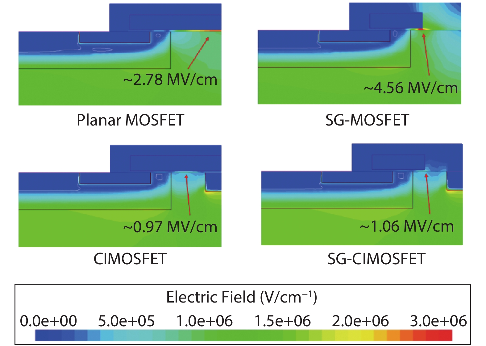 | Parameter | Planar MOSFET | SG-MOSFET | CI-MOSFET | SG-CIMOSFET | Unit |