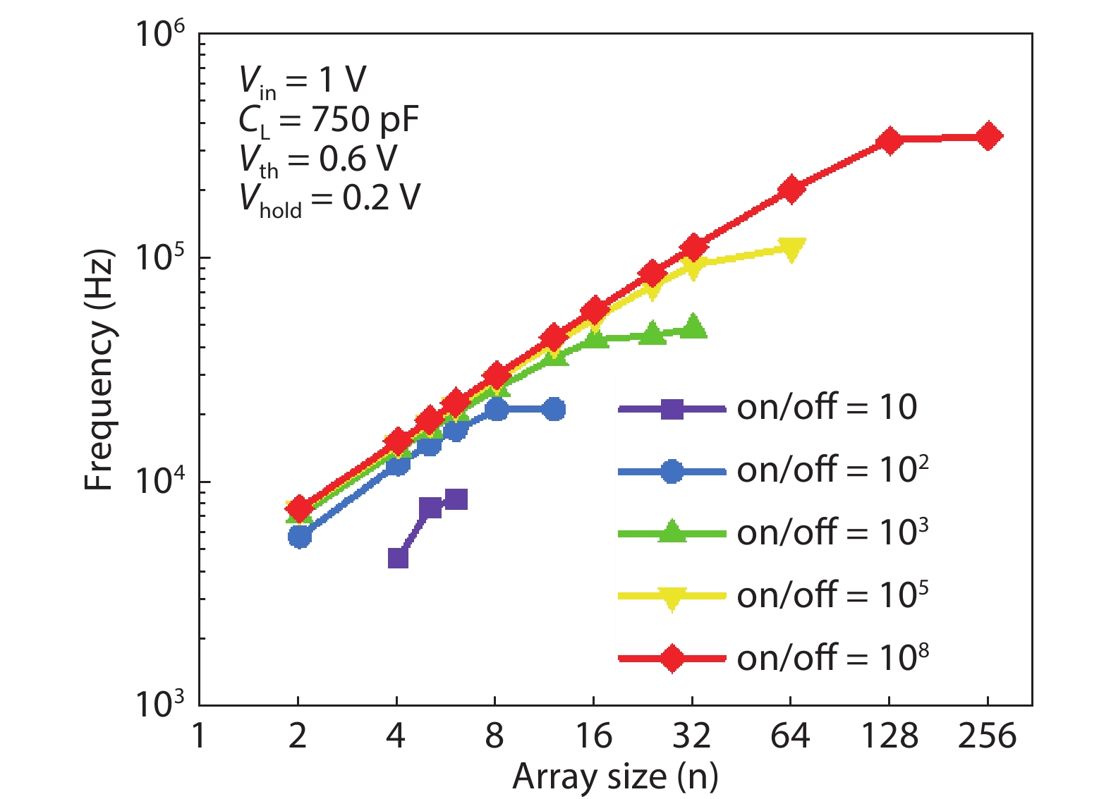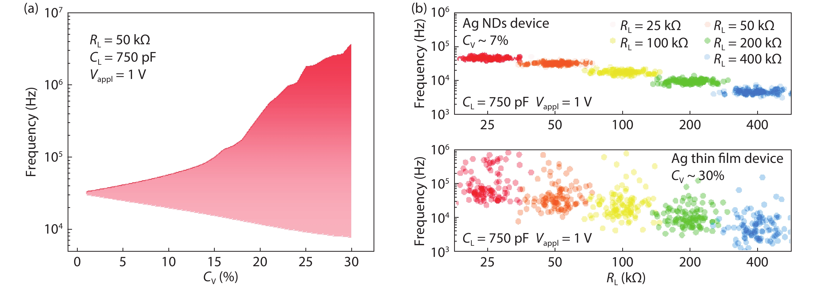 Abstract: Low-power and low-variability artificial neuronal devices are highly desired for high-performance neuromorphic computing. In this paper, an oscillation neuron based on a low-variability Ag nanodots (NDs) threshold switching (TS) device with low operation voltage, large on/off ratio and high uniformity is presented. Measurement results indicate that this neuron demonstrates self-oscillation behavior under applied voltages as low as 1 V. The oscillation frequency increases with the applied voltage pulse amplitude and decreases with the load resistance. It can then be used to evaluate the resistive random-access memory (RRAM) synaptic weights accurately when the oscillation neuron is connected to the output of the RRAM crossbar array for neuromorphic computing. Meanwhile, simulation results show that a large RRAM crossbar array (> 128 × 128) can be supported by our oscillation neuron owing to the high on/off ratio (> 108) of Ag NDs TS device. Moreover, the high uniformity of the Ag NDs TS device helps improve the distribution of the output frequency and suppress the degradation of neural network recognition accuracy (< 1%). Therefore, the developed oscillation neuron based on the Ag NDs TS device shows great potential for future neuromorphic computing applications.