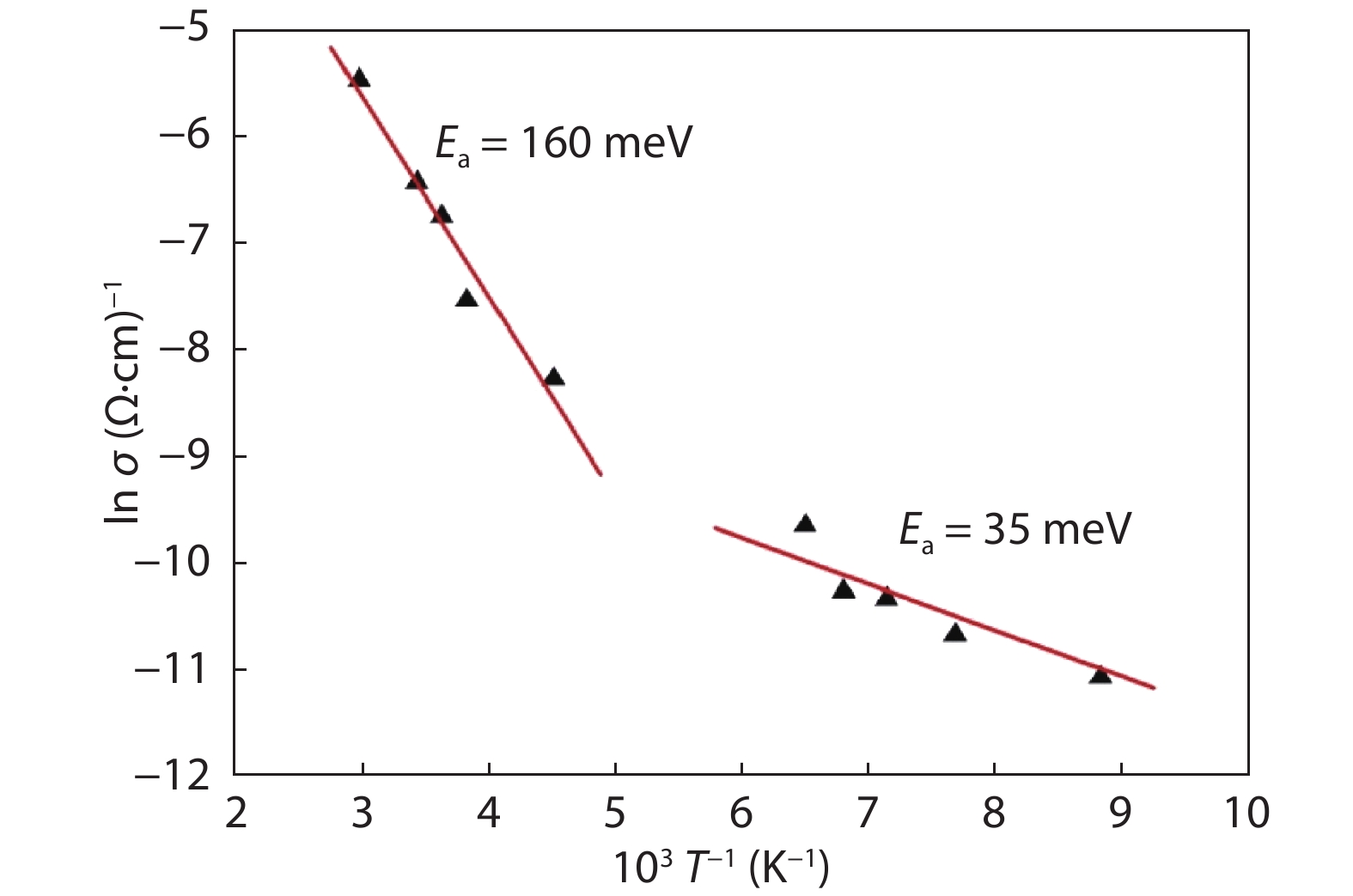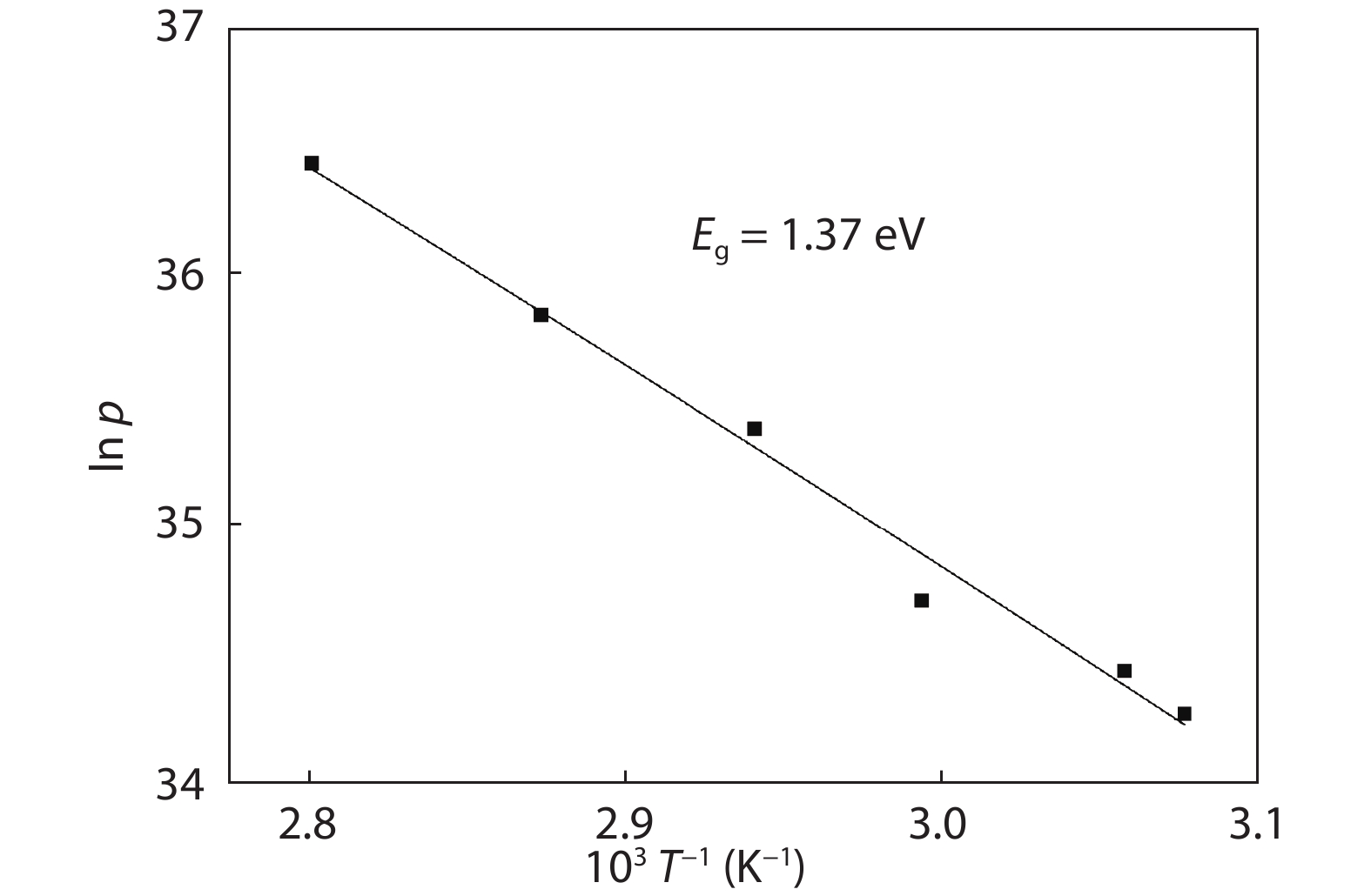 Abstract: In this work, a Cu2ZnSnS4 (CZTS) ingot is grown via a melting method, then cooled; the resulting molten stoichiometric mixture is sealed off in a quartz ampoule under vacuum. The CZTS powder chemical composition analyses are determined using energy dispersive spectroscopy, and revealing the slightly Cu-rich and Zn-poor character of the ingot. Powder X-ray diffraction analysis reveals a crystalline structure with a kesterite phase formation, and a preferred orientation of (112) plane. The lattice constants of the a- and c- axes, calculated based on the XRD analyses, are a = 5.40 ? and c = 10.84 ?. Based on Hall measurements at room temperature, we find that the crystal exhibits p-type conductivity, with a high concentration of 1018 cm–3, a resistivity of 1.7 Ω cm, and a mobility of 10.69 cm2V–1s–1. Activation energies are estimated based on an Arrhenius plot of conductivity versus 1/T, for a temperature range of 80–350 K, measuring 35 and 160 meV in low- and high-temperature regimes, respectively, which is attributed to complex defects (2CuZn+SnZn) and antisite defects (CuZn), respectively. The observed scattering mechanisms are attributed to ionized impurities and acoustic phonons at low and high temperatures, respectively. The extracted band-gap is 1.37 eV.