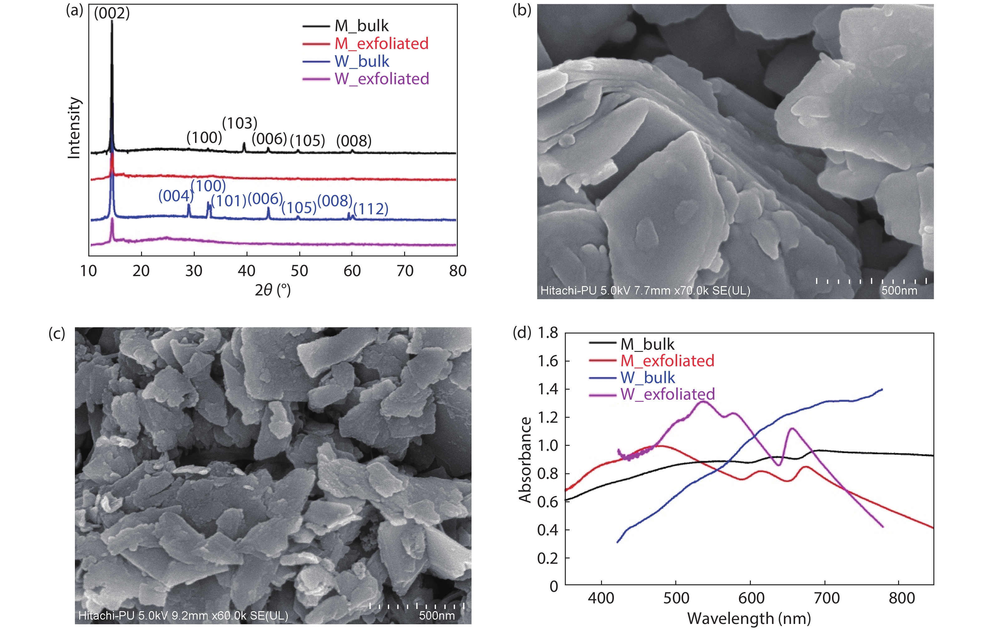 Fig. 2.  (Color online) Represents efficient exfoliation of bulk TMDs through (a) XRD spectra of MoS2, (b, c) FESEM of M_bulk and M_exfoliated, and (d) UV–visible spectra of all samples.