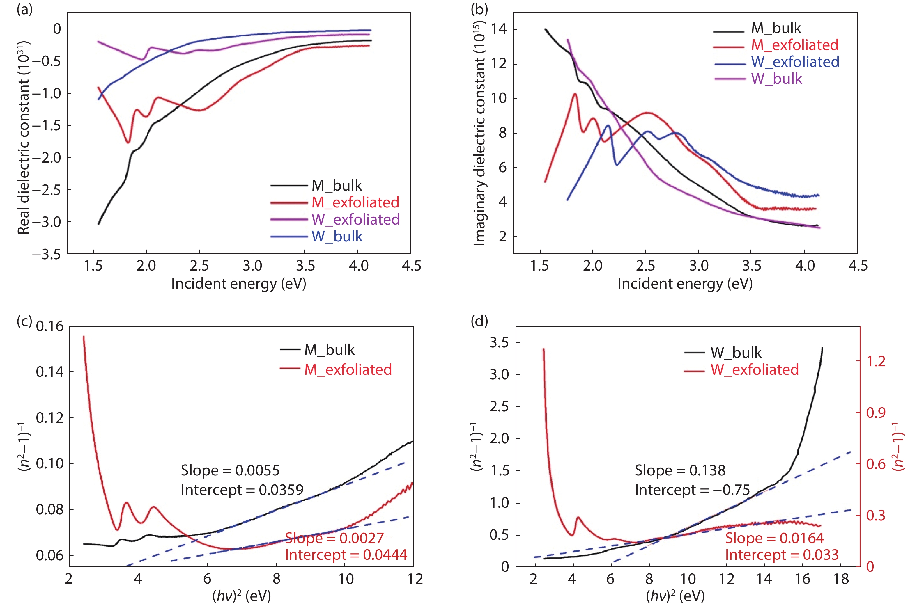 Fig. 5.  (Color online) Variation of (a) real part and (b) imaginary part of dielectric constant with incident energy for all samples. WDM plots for (c) M_bulk, M_exfoliated and (d) W_bulk, W_exfoliated.