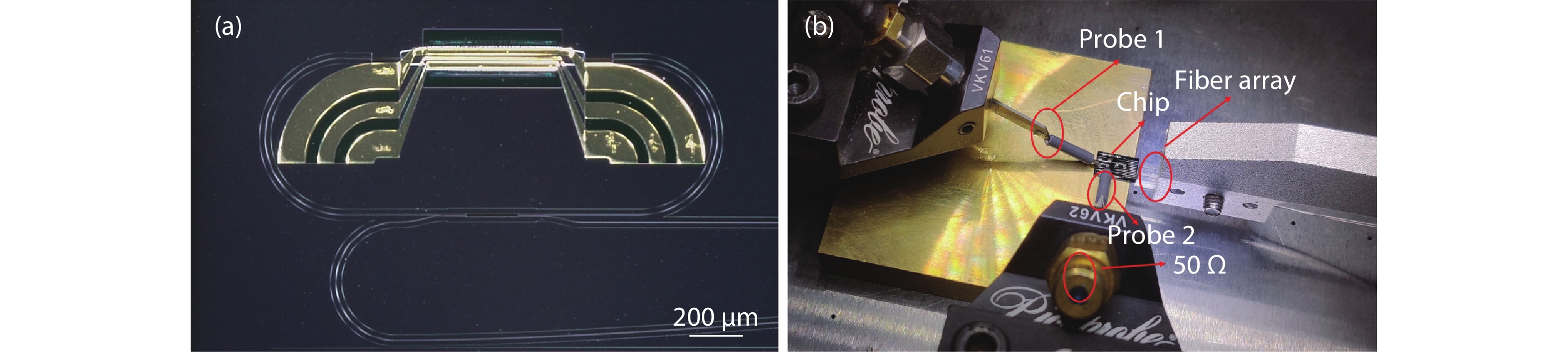 Fig. 2.  (Color online) (a) A photograph of the microring modulator with a scale bar of 200 μm$ \mathrm{ } $. (b) A photograph of the chip coupled to the fiber array and probes for experimental test.