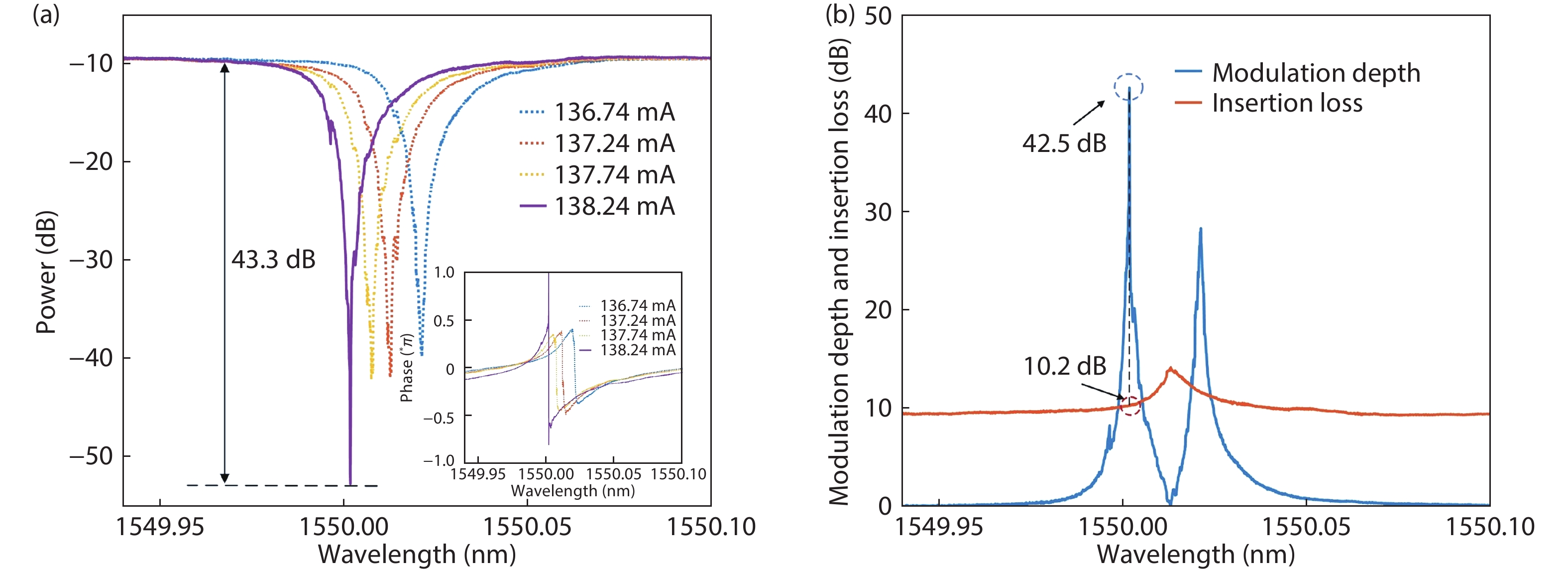 Fig. 4.  (Color online) (a) The transmission spectra of the microring modulator under four injection currents applied to the SOA. (b) Modulation depth and insertion loss with currents from 136.74 to 138.24 mA.