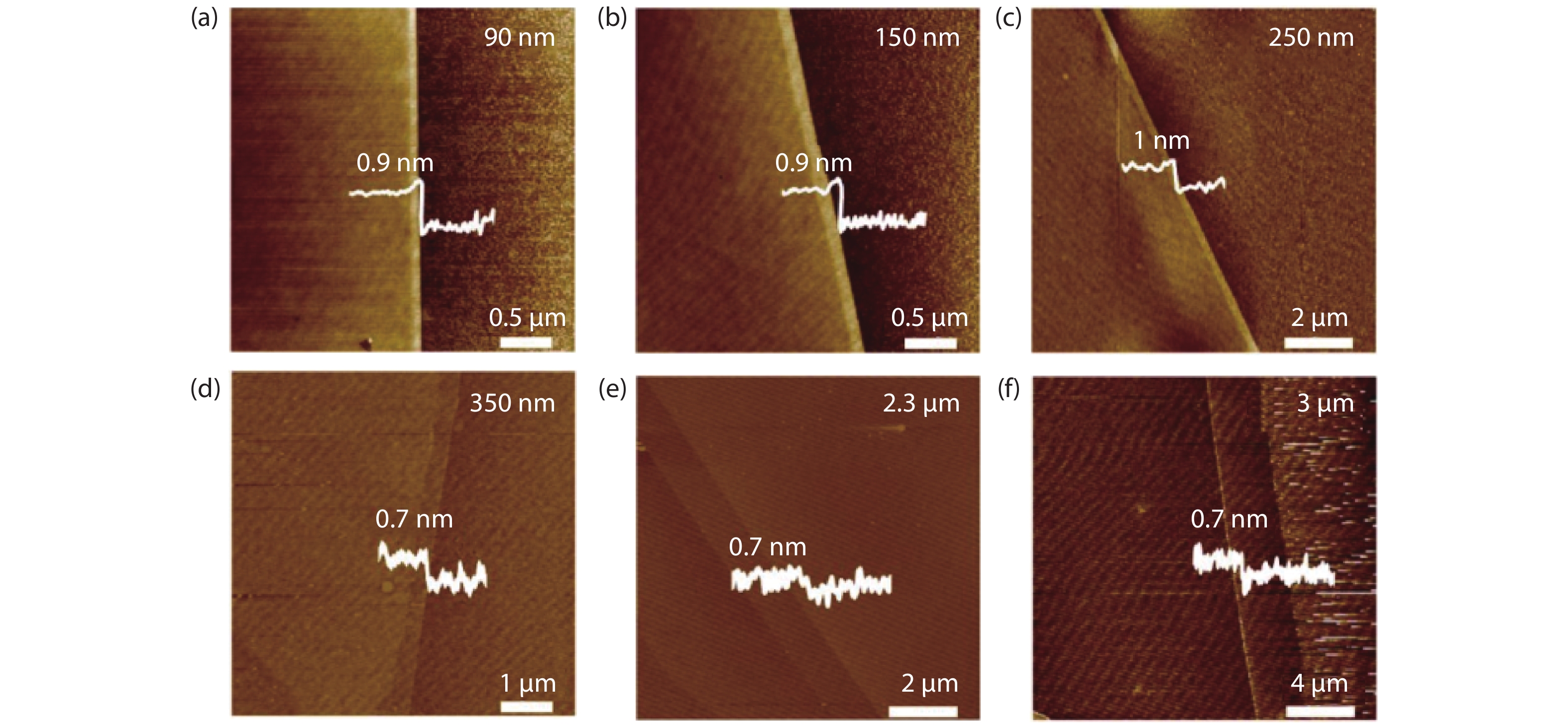 Fig. 3.  (Color online) AFM images of WS2/WSe2 lateral heterostructure when the growth time are (a) 5 s, (b) 7 s, (c) 9 s, (d) 11 s, (e) 30 s and (f) 40 s.
