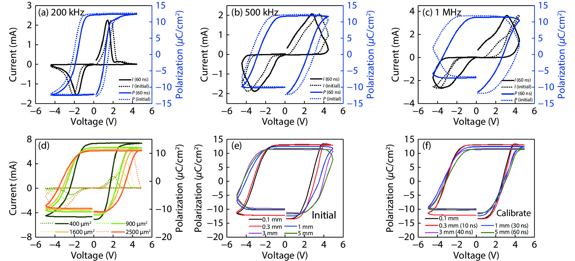 Abstract: Ferroelectric hysteresis loop measurement under high driving frequency generally faces great challenges. Parasitic factors in testing circuits such as leakage current and RC delay could result in abnormal hysteresis loops with erroneous remnant polarization (Pr) and coercive field (Ec). In this study, positive-up-negative-down (PUND) measurement under a wide frequency range was performed on a 10-nm thick Hf0.5Zr0.5O2 ferroelectric film. Detailed analysis on the leakage current and RC delay was conducted as the polarization switching occurs in the FE capacitor. After considering the time lag caused by RC delay, reasonable calibration of current response over the voltage pulse stimulus was employed in the integral of polarization current over time. In such a method, rational P–V loops measured at high frequencies (>1 MHz) was successfully achieved. This work provides a comprehensive understanding on the effect of parasitic factors on the polarization switching behavior of FE films.