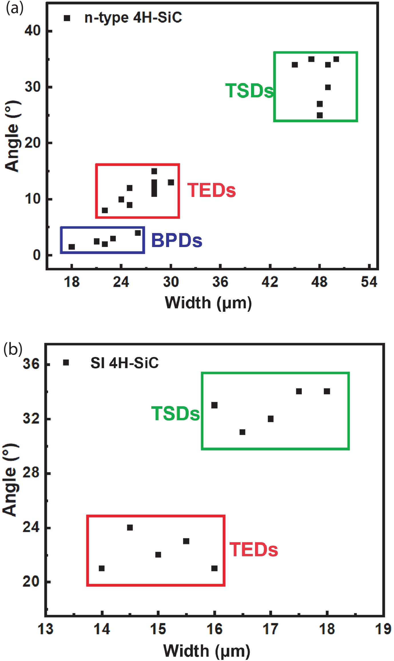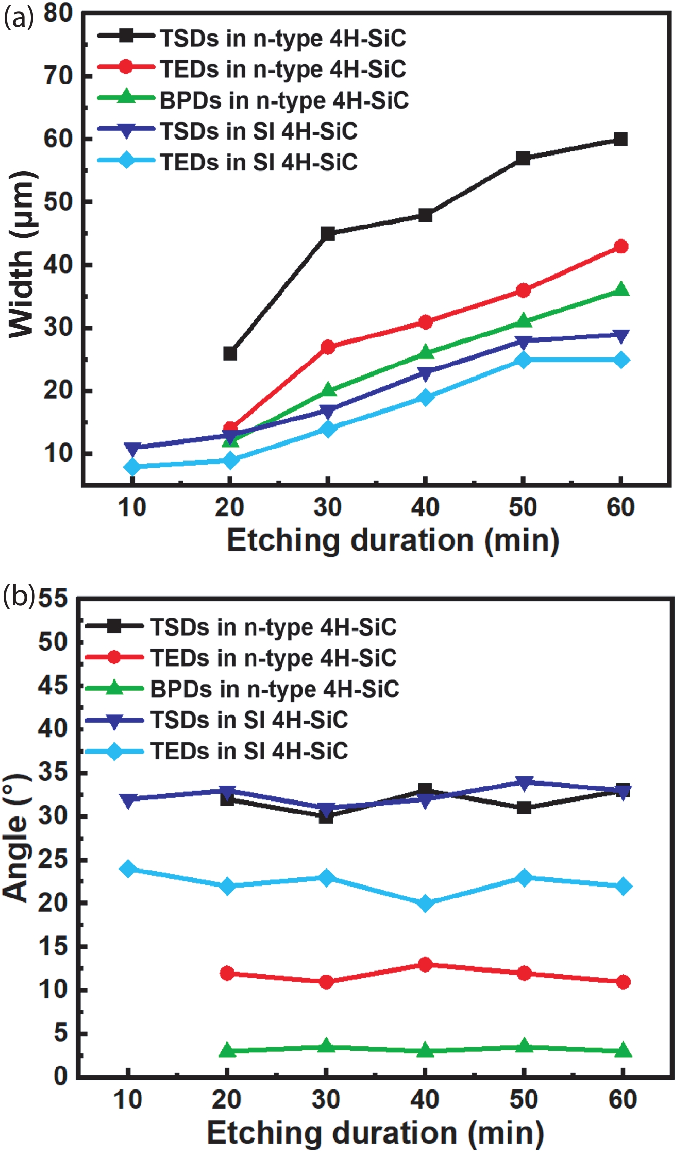 Abstract: Discrimination of dislocations is critical to the statistics of dislocation densities in 4H silicon carbide (4H-SiC), which are routinely used to evaluate the quality of 4H-SiC single crystals and homoepitaxial layers. In this work, we show that the inclination angles of the etch pits of molten-alkali etched 4H-SiC can be adopted to discriminate threading screw dislocations (TSDs), threading edge dislocations (TEDs) and basal plane dislocations (BPDs) in 4H-SiC. In n-type 4H-SiC, the inclination angles of the etch pits of TSDs, TEDs and BPDs in molten-alkali etched 4H-SiC are in the ranges of 27°?35°, 8°?15° and 2°?4°, respectively. In semi-insulating 4H-SiC, the inclination angles of the etch pits of TSDs and TEDs are in the ranges of 31°?34° and 21°?24°, respectively. The inclination angles of dislocation-related etch pits are independent of the etching duration, which facilitates the discrimination and statistic of dislocations in 4H-SiC. More significantly, the inclination angle of a threading mixed dislocations (TMDs) is found to consist of characteristic angles of both TEDs and TSDs. This enables to distinguish TMDs from TSDs in 4H-SiC.