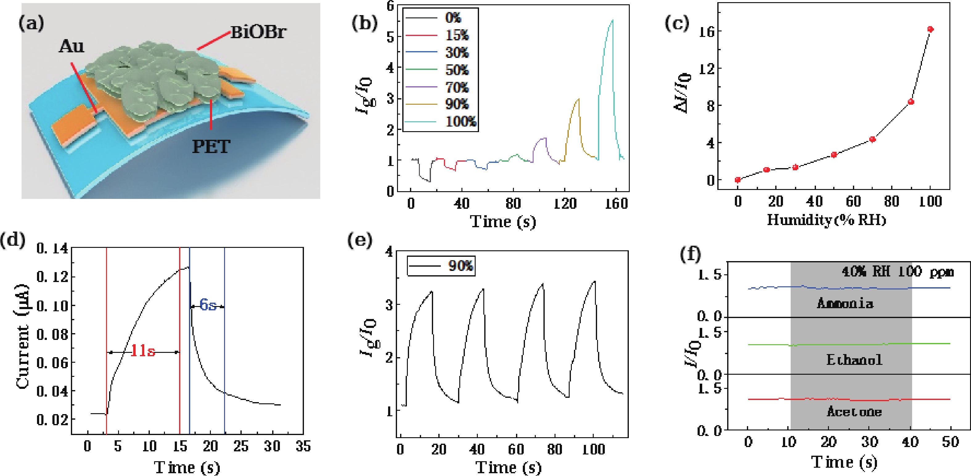 Abstract: Flexible humidity sensors are effective portable devices for human respiratory monitoring. However, the current preparation of sensitive materials need harsh terms and the small production output limits their practicability. Here, we report a synthesis method of single-crystal BiOBr nanosheets under room temperature and atmospheric pressure based on a sonochemical strategy. A flexible humidity sensor enabled by BiOBr nanosheets deliver efficient sensing performance, a high humidity sensitivity (Ig/I0 = 550%) with relative humidity from 40% to 100%, an excellent selectivity, and a detection response/recovery time of 11 and 6 s, respectively. The flexible humidity sensor shows a potential application value as a wearable monitoring device for respiratory disease prevention and health monitoring.