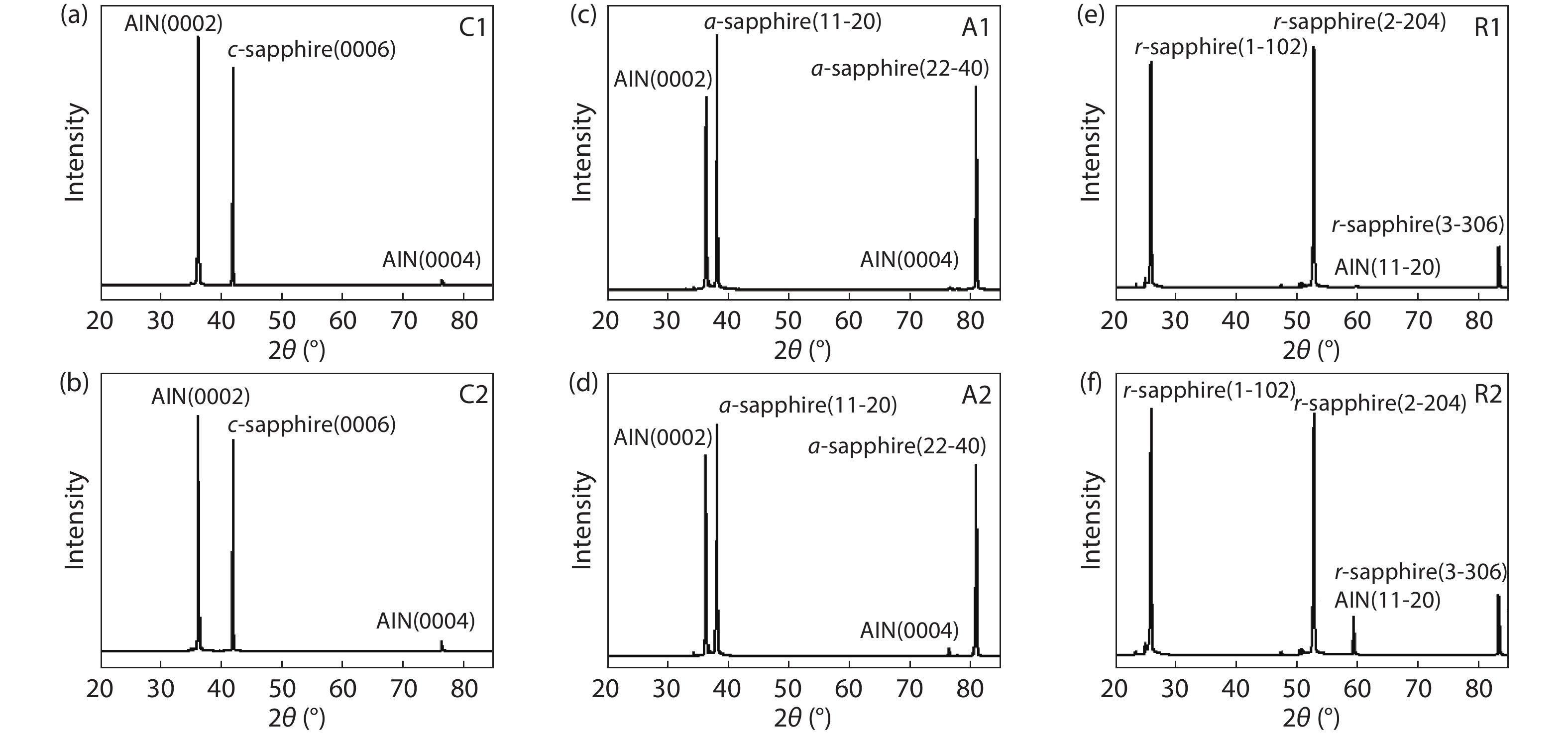 Abstract: AlN thin films were deposited on c-, a- and r-plane sapphire substrates by the magnetron sputtering technique. The influence of high-temperature thermal annealing (HTTA) on the structural, optical properties as well as surface stoichiometry were comprehensively investigated. The significant narrowing of the (0002) diffraction peak to as low as 68 arcsec of AlN after HTTA implies a reduction of tilt component inside the AlN thin films, and consequently much-reduced dislocation densities. This is also supported by the appearance of E2(high) Raman peak and better Al–N stoichiometry after HTTA. Furthermore, the increased absorption edge after HTTA suggests a reduction of point defects acting as the absorption centers. It is concluded that HTTA is a universal post-treatment technique in improving the crystalline quality of sputtered AlN regardless of sapphire orientation.