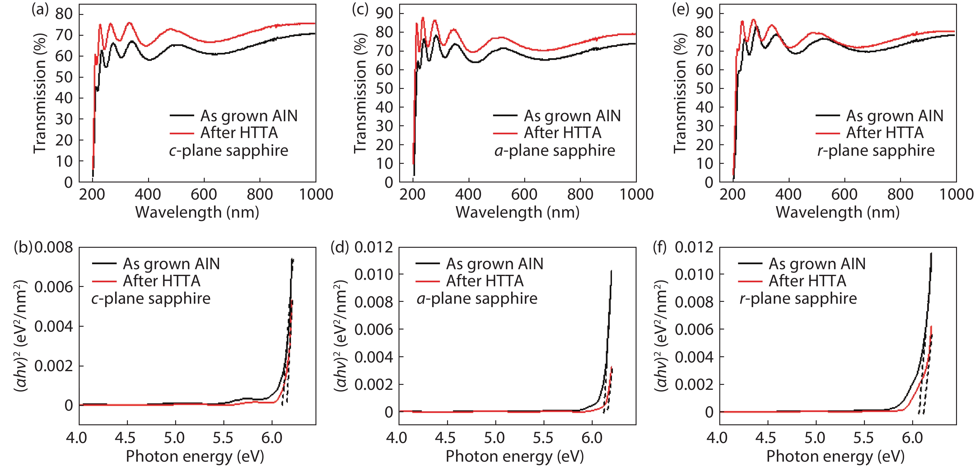 Table 1. Calculated absorption edges of AlN thin films acquired by α2 versus photon energy curve, rms roughness and the FWHM of the (002) diffraction peaks.