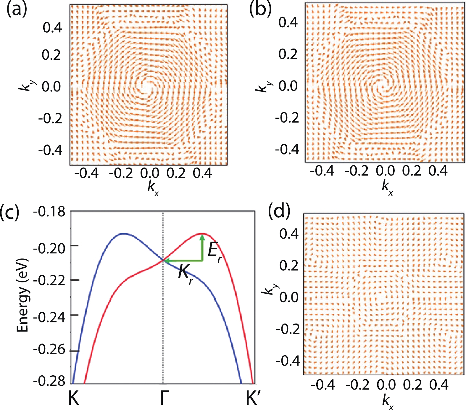 Table 2. Band structure analysis of VXY. ΔC and ΔV are the magnitude of the energy band split between the conduction band and the valence band at point K. Eg is the band gap at K point. $ {E}_{\mathrm{r}} $ and Kr are the splitting of the energy and wave vector. $ {\alpha }_{\mathrm{r}} $ is the Rashba parameter.