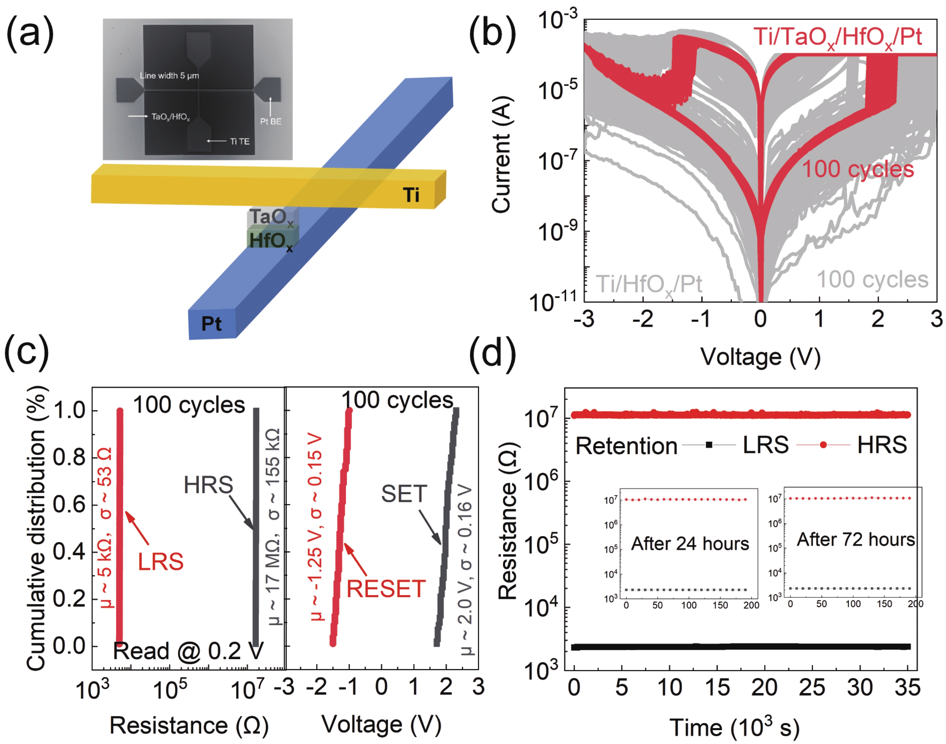 Abstract: Resistive switching random access memory (RRAM) is considered as one of the potential candidates for next-generation memory. However, obtaining an RRAM device with comprehensively excellent performance, such as high retention and endurance, low variations, as well as CMOS compatibility, etc., is still an open question. In this work, we introduce an insert TaOx layer into HfOx-based RRAM to optimize the device performance. Attributing to robust filament formed in the TaOx layer by a forming operation, the local-field and thermal enhanced effect and interface modulation has been implemented simultaneously. Consequently, the RRAM device features large windows (> 103), fast switching speed (~ 10 ns), steady retention (> 72 h), high endurance (> 108 cycles), and excellent uniformity of both cycle-to-cycle and device-to-device. These results indicate that inserting the TaOx layer can significantly improve HfOx-based device performance, providing a constructive approach for the practical application of RRAM.