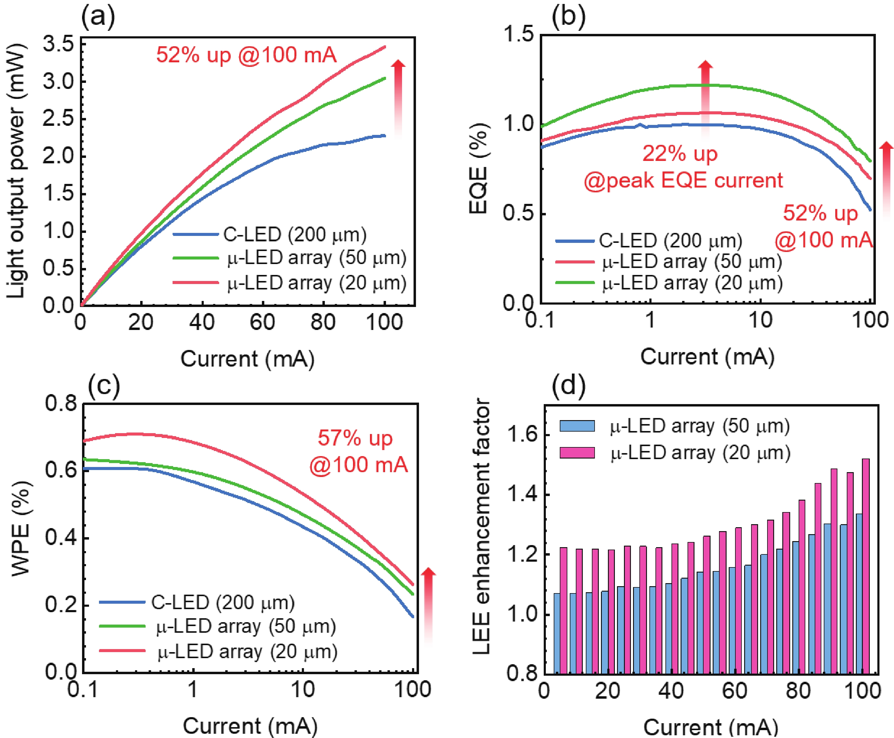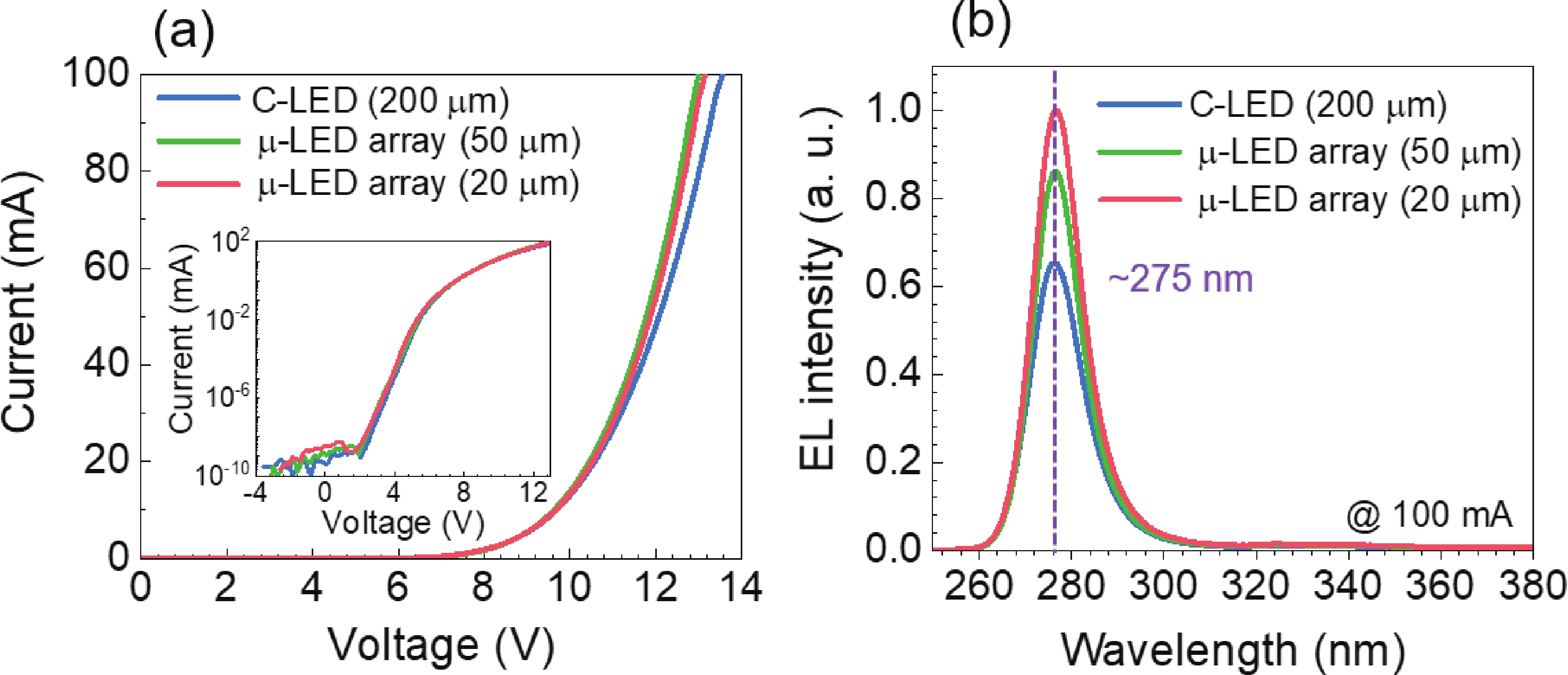 Abstract: In this work, we design and fabricate a deep ultraviolet (DUV) light-emitting array consisting of 10 × 10 micro-LEDs (μ-LEDs) with each device having 20 μm in diameter. Strikingly, the array demonstrates a significant enhancement of total light output power by nearly 52% at the injection current of 100 mA, in comparison to a conventional large LED chip whose emitting area is the same as the array. A much higher (~22%) peak external quantum efficiency, as well as a smaller efficiency droop for μ-LED array, was also achieved. The numerical calculation reveals that the performance boost can be attributed to the higher light extraction efficiency at the edge of each μ-LED. Additionally, the far-field pattern measurement shows that the μ-LED array possesses a better forward directionality of emission. These findings shed light on the enhancement of the DUV LEDs performance and provide new insights in controlling the light behavior of the μ-LEDs.