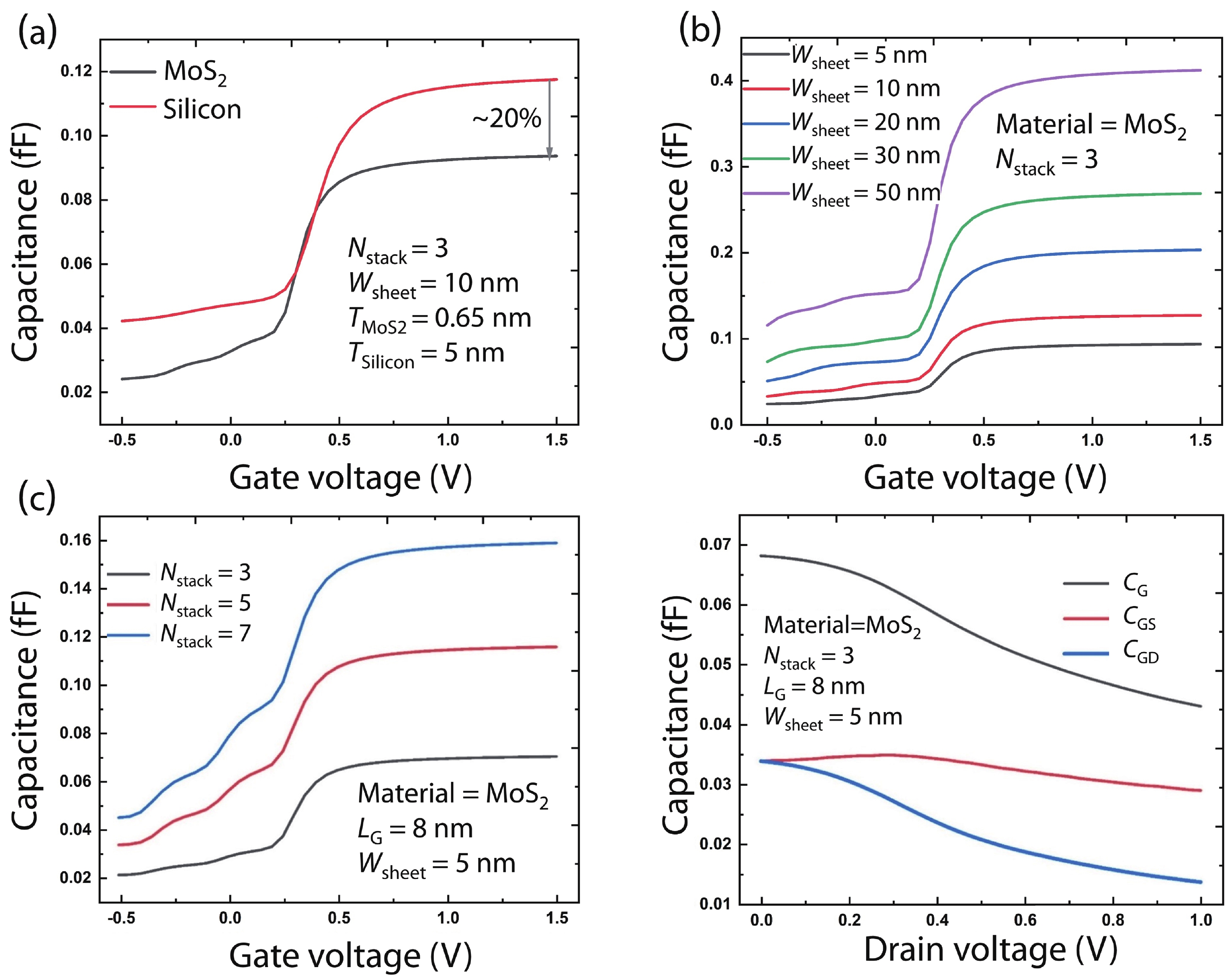 Abstract: Transition metal dichalcogenides are nowadays appealing to researchers for their excellent electronic properties. Vertical stacked nanosheet FET (NSFET) based on MoS2 are proposed and studied by Poisson equation solver coupled with semi-classical quantum correction model implemented in Sentaurus workbench. It is found that, the 2D stacked NSFET can largely suppress short channel effects with improved subthreshold swing and drain induced barrier lowering, due to the excellent electrostatics of 2D MoS2. In addition, small-signal capacitance is extracted and analyzed. The MoS2 based NSFET shows great potential to enable next generation electronics.